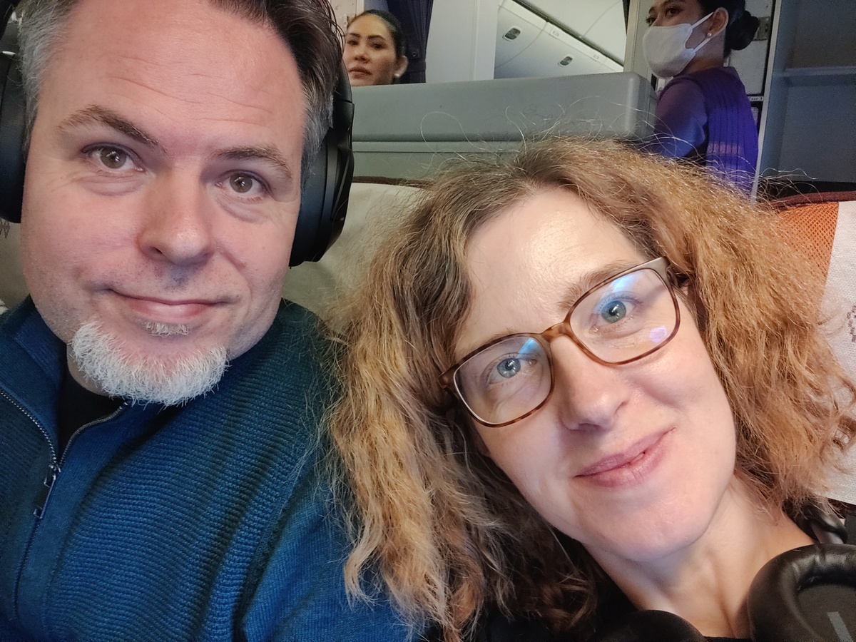 Der Flug mit Singapore Airlines ist durchaus angenehm. Die Beinfreiheit ist auch in der Economy Class deutlich besser, als bei den europäischen Airlines mit denen wir bisher geflogen sind. Wir erleben auf diesem Flug zwar einige Turbulenzen, aber dafür kann die Airline ja nichts.