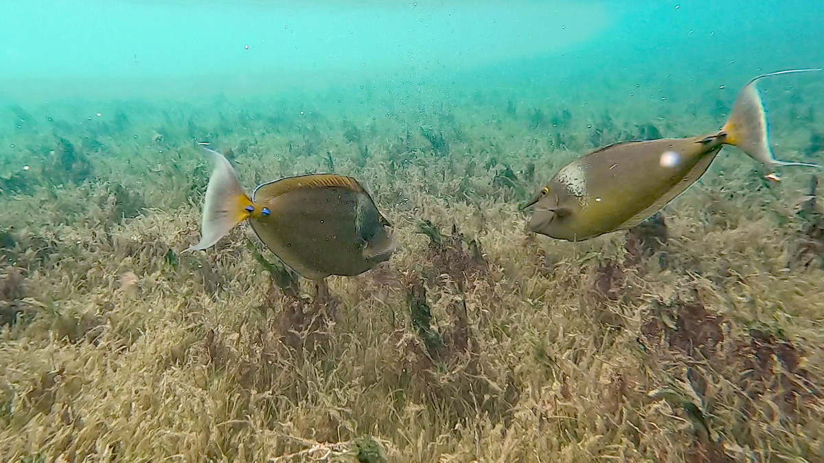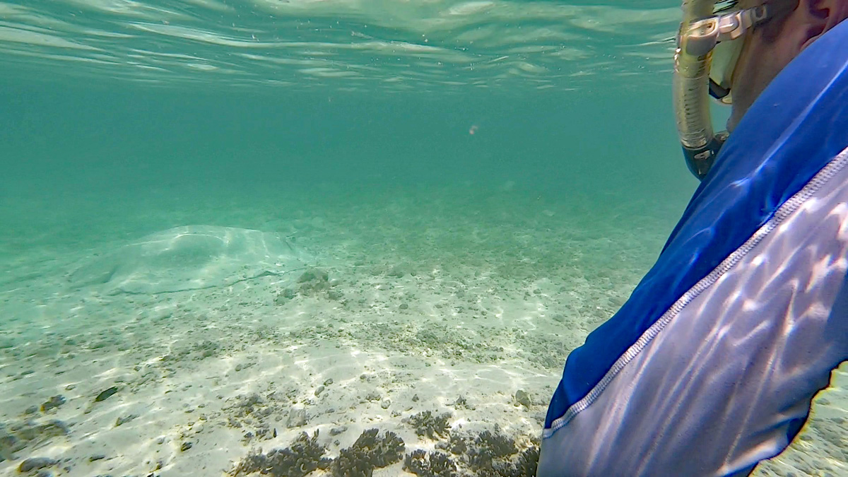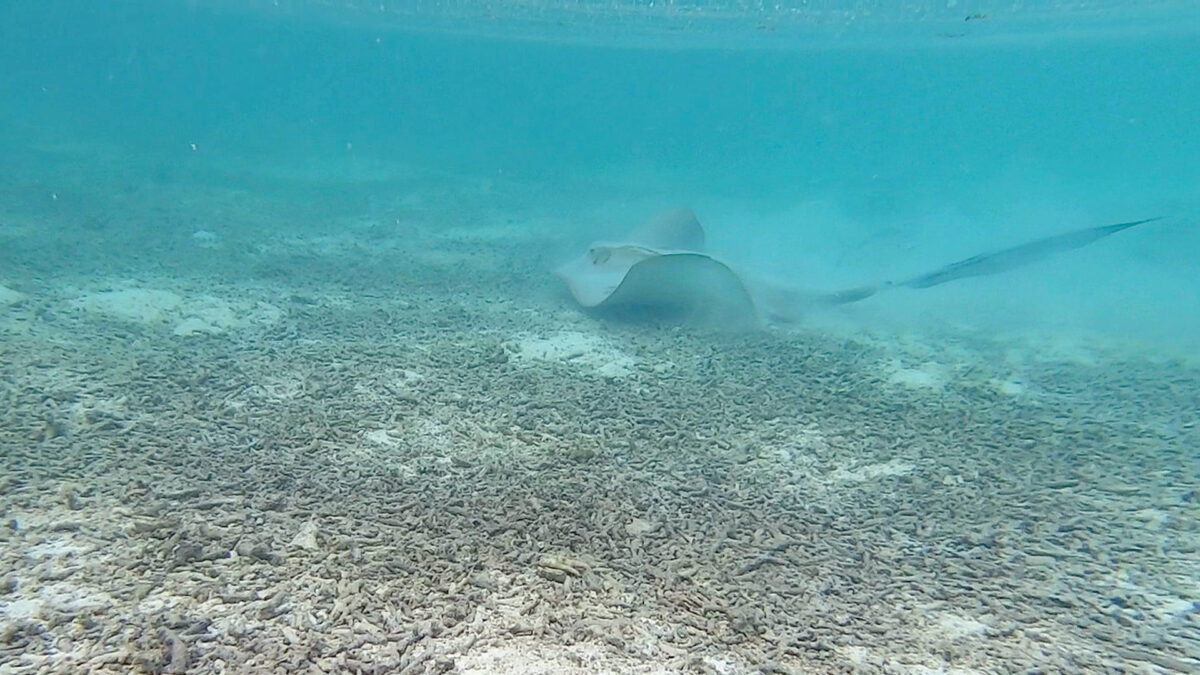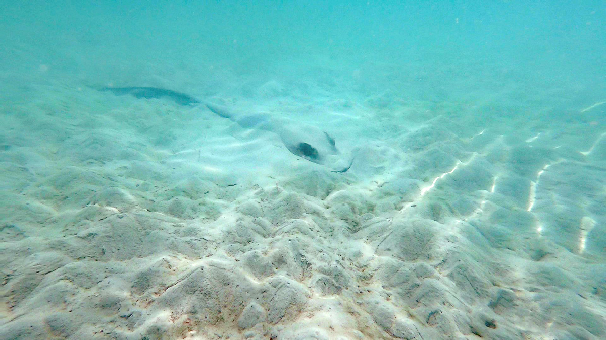Per Zufall entdecken wir außerdem einen Federschwanzrochen, der nur wenige Meter vom Strand entfernt im Sand verborgen ruht. Unser Highlight zum Abschluss des Urlaubs ist jedoch eine weitere Begegnung mit einer Schildkröte, die wir beim Schnorcheln ein Stück begleiten dürfen – diesmal sogar mit der GoPro, um diesen einzigartigen Moment festzuhalten.