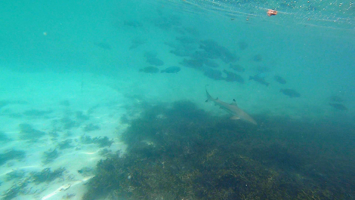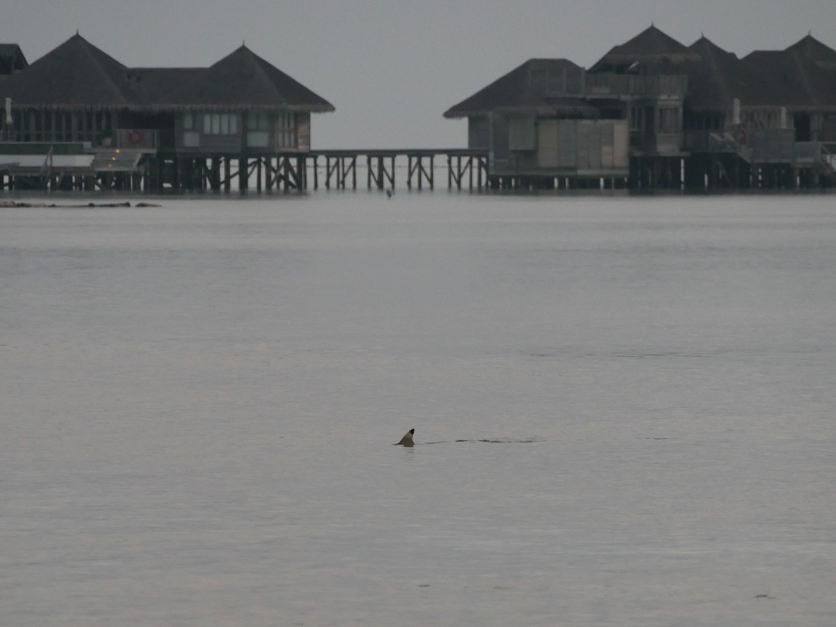 Diesen Abschnitt beginnen wir mit einem Disclaimer: wer auf den Malediven ins Meer geht, schwimmt zwangsläufig mit Haien. In Ufernähe handelt es sich dabei um Riffhaie, welche für Menschen als ungefährlich gelten. Wir haben auch bereits in mehreren Urlauben die Erfahrung gemacht, dass diese Tiere Menschen gegenüber scheu sind und eher abdrehen, wenn sie Menschen entdecken. Doch trotzdem können wir uns nicht davon frei machen, dass der Puls ein wenig schneller wird, sobald wir die eindeutige Silhouette dieses Jägers der Meere in unserer Nähe entdecken. Aber natürlich ist es auch immer wieder ein Höhepunkt einen Hai beim Schnorcheln zu sehen. Wir möchten weder als waghalsige Draufgänger wahrgenommen werden, noch möchten wir jemand anderes dazu animieren, es uns gleich zu tun. Jeder Maledivenurlauber muss für sich selbst entscheiden, wie er oder sie mit diesem Thema umgeht.