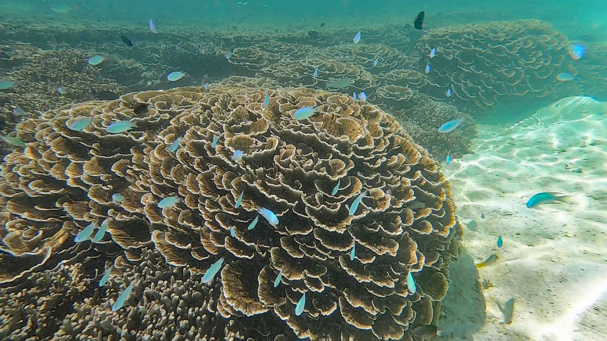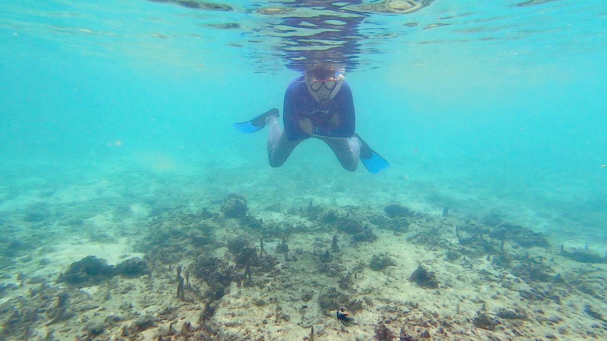 Schnorcheln ist immer auch ein Stück Glückssache. Schon am ersten Tag begegnen wir einer Schildkröte und entdecken einen friedlich am Meeresboden ruhenden Igelrochen. Genau in diesem Moment gleitet seitlich ein Hai vorbei – fast so, als wolle er sagen: „Ey, was macht ihr hier? Lasst meinen Kumpel schlafen.“ Natürlich halten wir stets respektvollen Abstand zu allen Lebewesen unter Wasser, schließlich sind wir hier nur Gäste. Ebenso vorsichtig bewegen wir uns zwischen den Korallengärten, um nichts zu beschädigen. Unser Eindruck: Die Korallen hier sind insgesamt in einem besseren Zustand als bei unseren letzten Destinationen, den Seychellen und Mauritius.