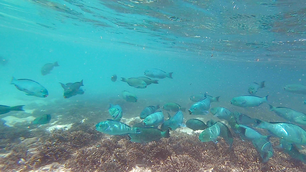Beeindruckend ist zudem ein großer Schwarm leuchtend grüner Papageifische, der an uns vorbeizieht – begleitet von gleich zwei Haien.