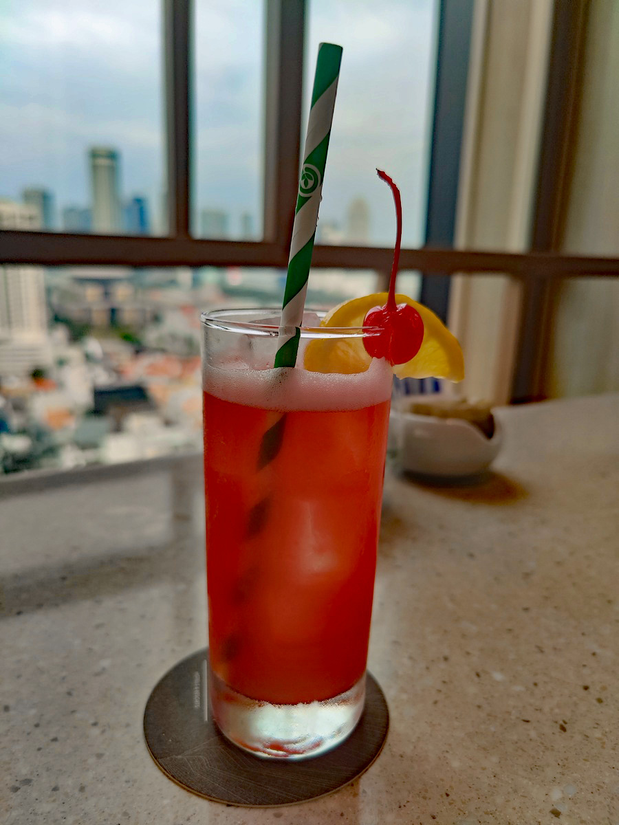 Natürlich probieren wir auch den berühmten Singapore Sling. Dieser Cocktail wurde Anfang des 20. Jahrhunderts im legendären Raffles Hotel in Singapur kreiert. Mit Gin, Kirsch- und Kräuterlikör, Grenadine und Ananassaft trifft er auch mehr als 100 Jahre nach seiner Erfindung noch immer den geschmacklichen Zeitgeist