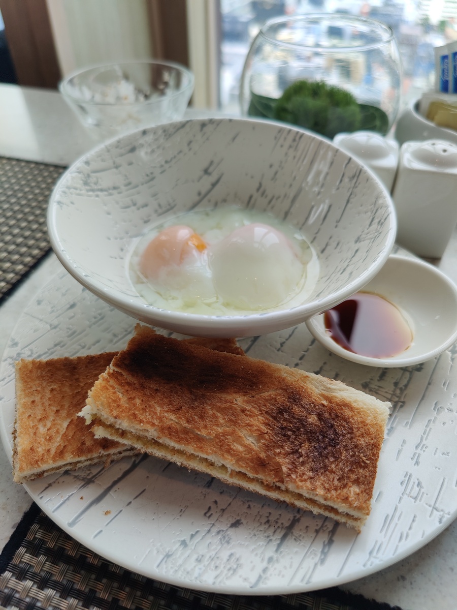 Dazu gibt es eine Schale mit zwei kurz gekochten Eiern, die mit Soja Sauce und Pfeffer, verrührt werden können. Hier dippt man das Kaya Toast ein und genießt anschließend den Geschmack aus süß und salzig. Klingt ungewöhnlich, schmeckt aber wirklich lecker.