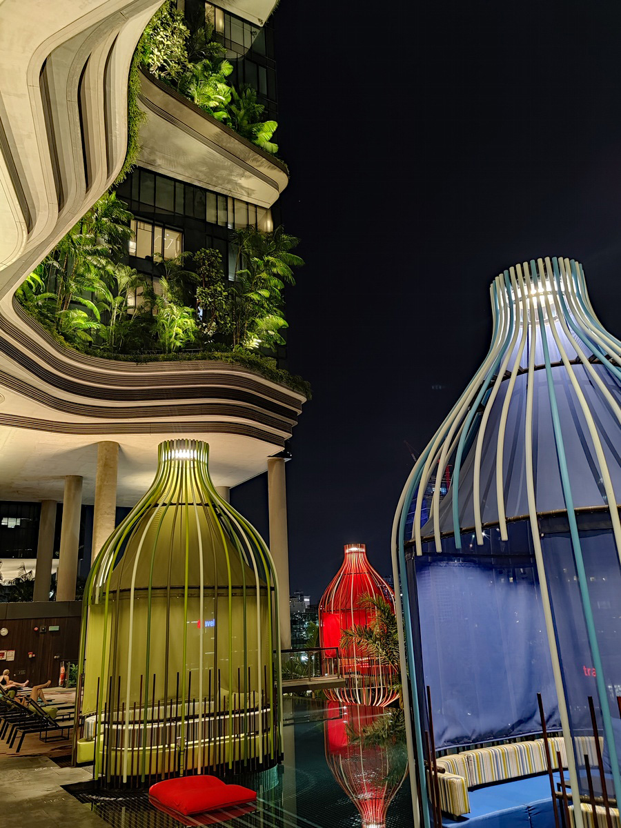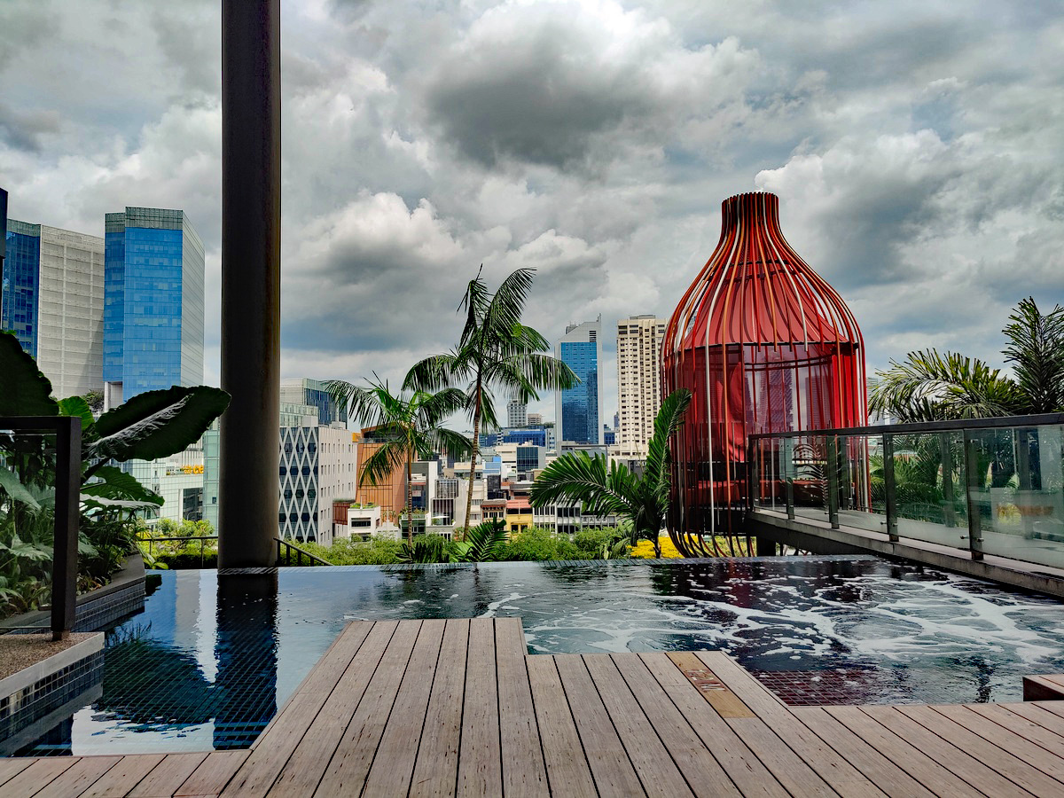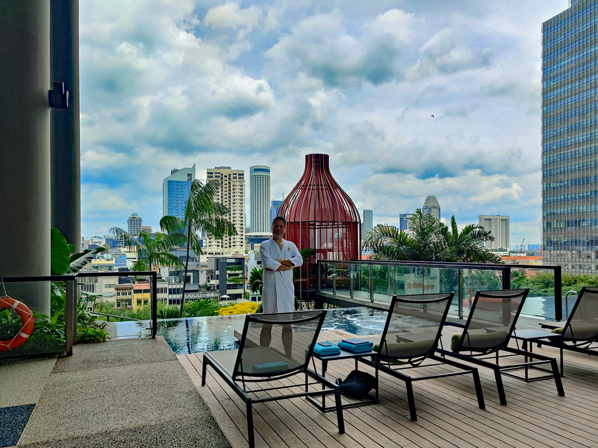 Der Blick aus dem 16. Stock auf das sich im Rekordtempo in Dunkelheit hüllende Singapur ist schlicht fantastisch. Besonders eindrucksvoll ist, wie die Skyline innerhalb weniger Minuten in ein funkelndes Lichtermeer verwandelt wird. Auf derselben Etage befindet sich zudem ein kleiner Dachgarten, in dem Kräuter und verschiedene Chili-Pflanzen gedeihen – ein charmantes Detail, das die urbane Atmosphäre mit einem Hauch Natur verbindet.