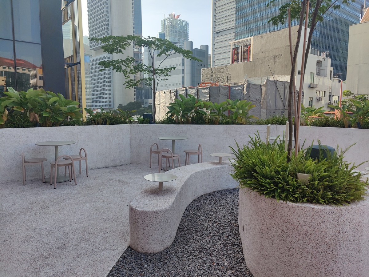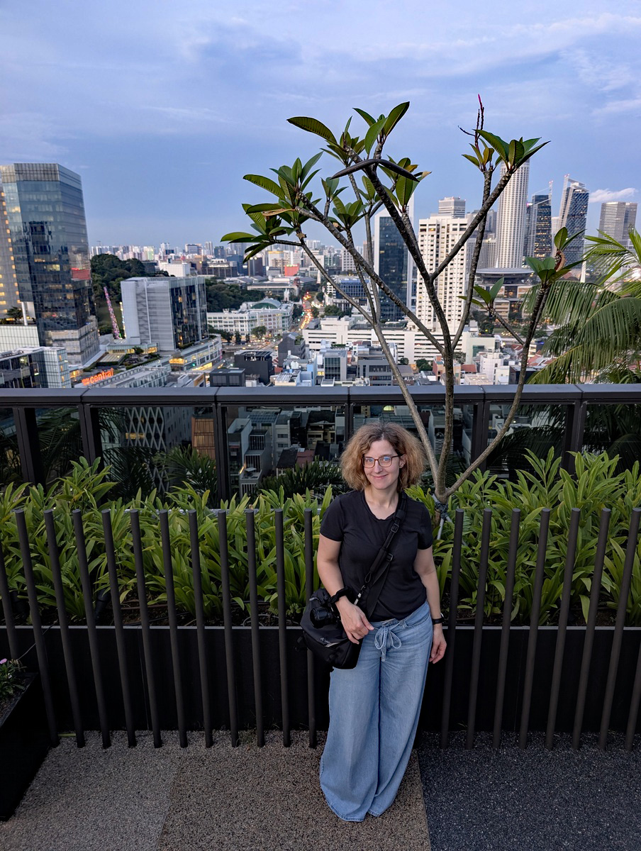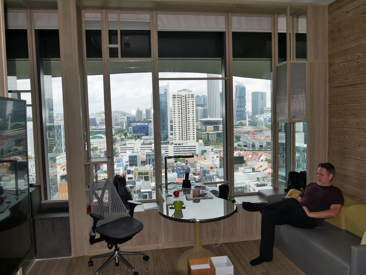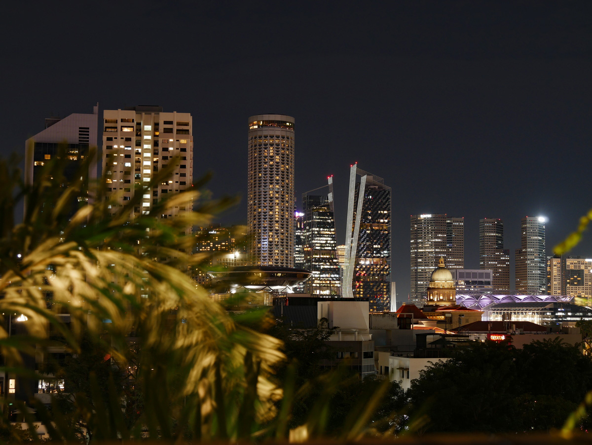 Der Blick aus dem 16. Stock auf das sich im Rekordtempo in Dunkelheit hüllende Singapur ist schlicht fantastisch. Besonders eindrucksvoll ist, wie die Skyline innerhalb weniger Minuten in ein funkelndes Lichtermeer verwandelt wird. Auf derselben Etage befindet sich zudem ein kleiner Dachgarten, in dem Kräuter und verschiedene Chili-Pflanzen gedeihen – ein charmantes Detail, das die urbane Atmosphäre mit einem Hauch Natur verbindet.
