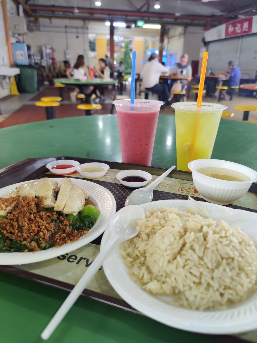 Wir entscheiden uns für Hainanese Chicken. Der berühmte Stand, dessen Betreiber sogar Gordon Ramsay in einem Wettbewerb geschlagen haben sollen, lockt zwar, doch die Schlange ist uns zu lang. Also wählen wir einen weniger frequentierten Stand und genießen dort das köstlich gegarte Hähnchen mit aromatischem Reis, Brühe, gegartem Pak Choi und den typischen Saucen. Dazu gibt es eine hausgemachte, frisch gepresste Zuckerrohrlimonade und Fruchtsaft.