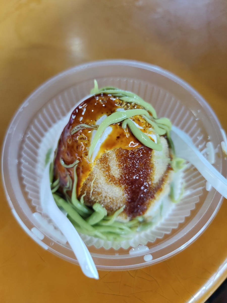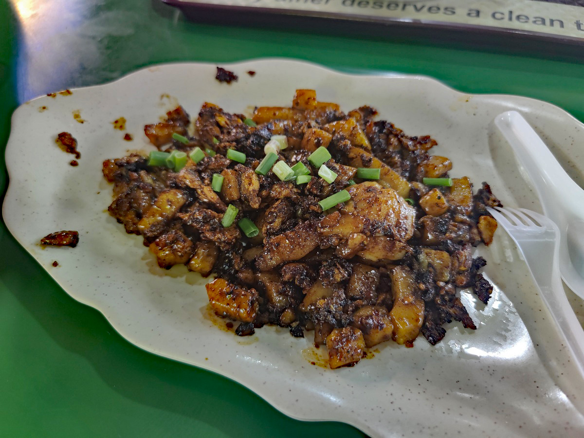 Als zweite Mahlzeit probieren wir Carrot Cake – der Name täuscht, denn Karotten sind hier keine drin. Stattdessen handelt es sich um gebratenen Rettich mit Eiern, Öl und Sojasauce: würzig, leicht pikant und sehr lecker. Zum Nachtisch gönnen wir uns geschreddertes Eis mit Kokosmilch, braunem Zuckersirup und einem grünen Beiwerk, das wir zunächst nicht einordnen können. Später erfahren wir, dass es sich um Cendol handelt – Reisnudeln, gefärbt mit dem Saft von Pandan-Blättern. Insgesamt ein rundum gelungenes Abendessen.