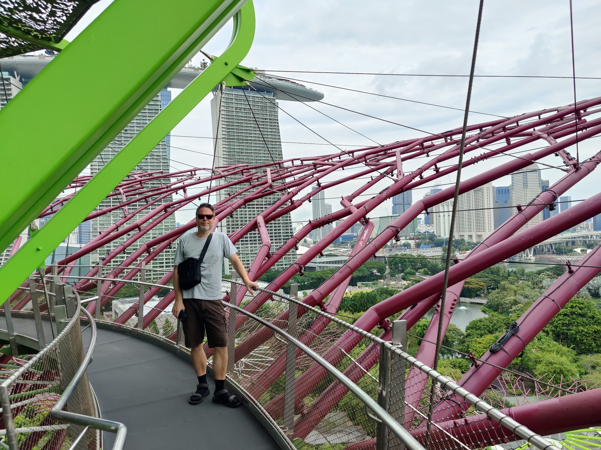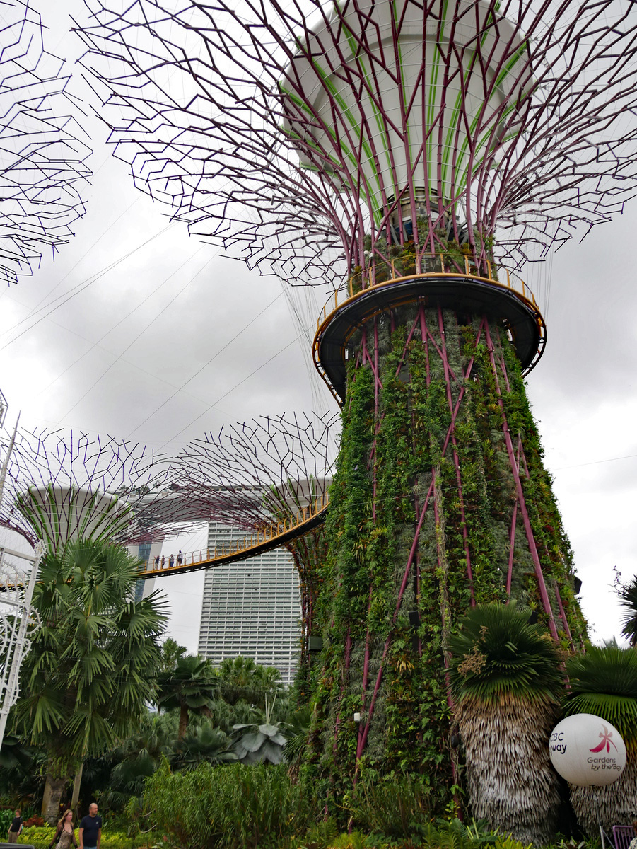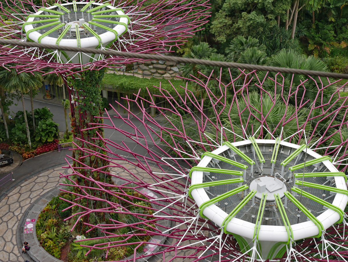 Wir durchqueren den Gardens by the Bay und beginnen mit dem Super Tree Observatory. Die Supertrees sind futuristische Stahlkonstruktionen von 25 bis 50 Metern Höhe, die wie überdimensionale, künstliche Bäume wirken. Sie sind mit einer Vielzahl von Pflanzen bewachsen – darunter Orchideen, Farne und Kletterpflanzen – und verschmelzen so Natur mit moderner Architektur. Der größte dieser Bäume dient als Aussichtsplattform und eröffnet einen großartigen Blick über die Marina Bay und den Hafen, in dem unzählige Frachtschiffe vor Anker liegen.