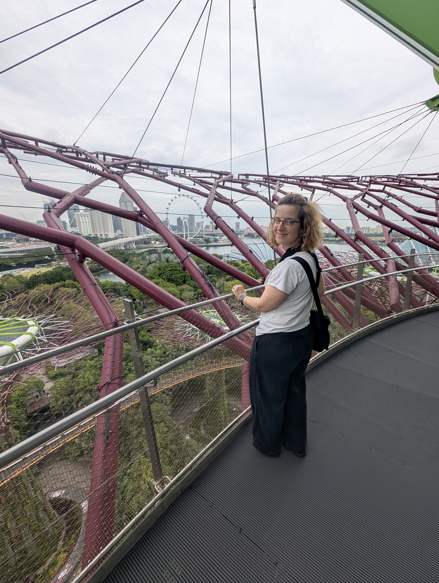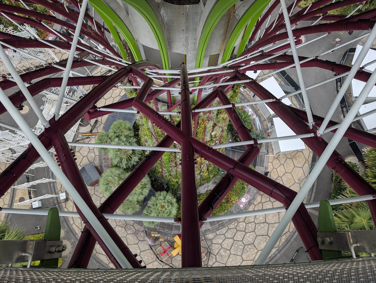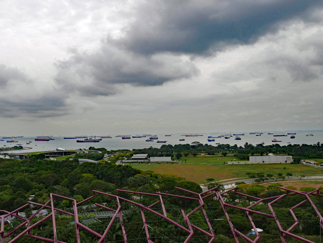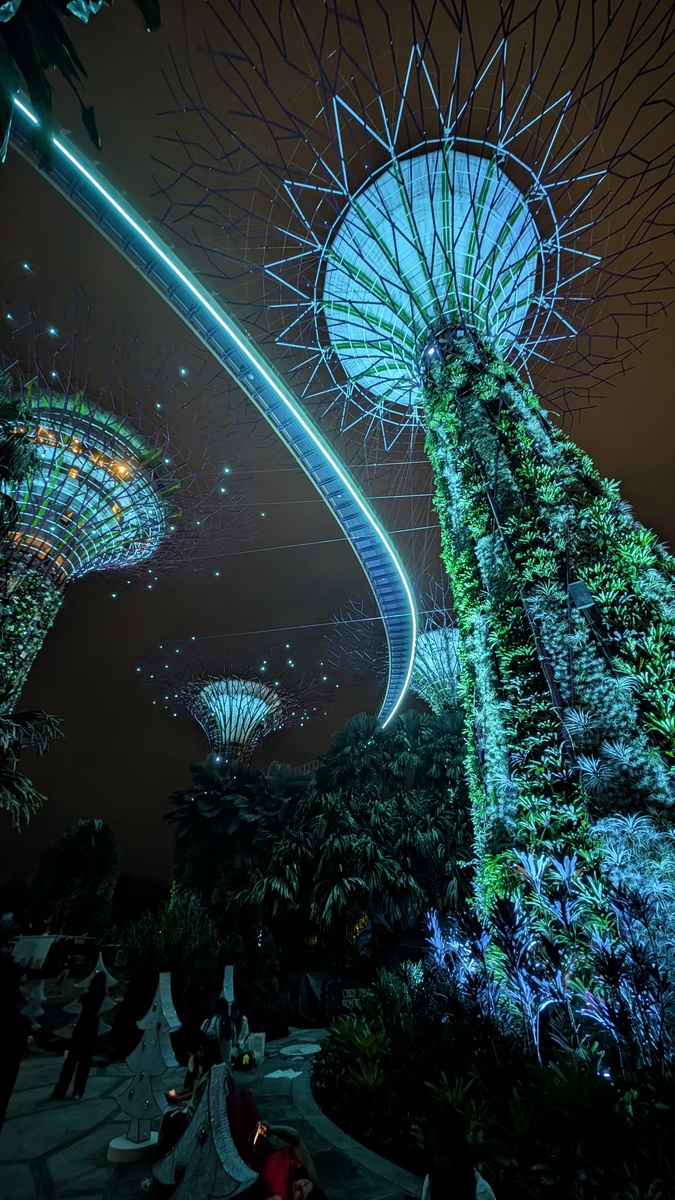 Wir durchqueren den Gardens by the Bay und beginnen mit dem Super Tree Observatory. Die Supertrees sind futuristische Stahlkonstruktionen von 25 bis 50 Metern Höhe, die wie überdimensionale, künstliche Bäume wirken. Sie sind mit einer Vielzahl von Pflanzen bewachsen – darunter Orchideen, Farne und Kletterpflanzen – und verschmelzen so Natur mit moderner Architektur. Der größte dieser Bäume dient als Aussichtsplattform und eröffnet einen großartigen Blick über die Marina Bay und den Hafen, in dem unzählige Frachtschiffe vor Anker liegen.