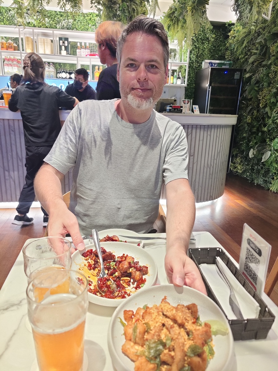 Nach einer kurzen Ruhepause im Hostel zieht es uns am Abend ins Clarke Quay. Vorbei an zahlreichen Restaurants, die nach Kundschaft Ausschau halten, landen wir schließlich im BYD Restaurant – vor allem, weil Singapurisches Craftbeer für 7 SGD pro Pint ein wirklich guter Preis ist. Wir bekommen einen schönen Platz und bestellen als Snacks zunächst das „Qin Si Chuan Mala Chicken“. Zuerst fragen wir uns, wie wir das jemals essen sollen, da es zur Hälfte aus Chilischoten besteht – am Ende ist es aber gar nicht so scharf. Außerdem probieren wir Pork Fingerlings, frittierte Schweinefleischstreifen, exotisch gewürzt und durchaus lecker. Das Craftbeer schmeckt ebenfalls hervorragend.
