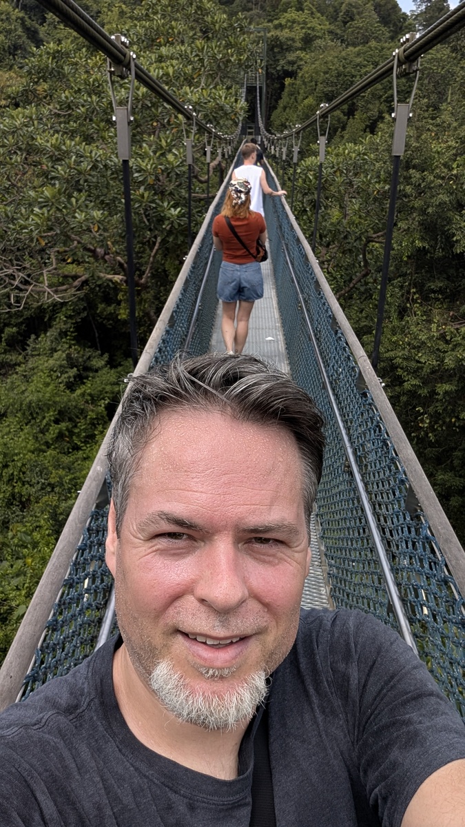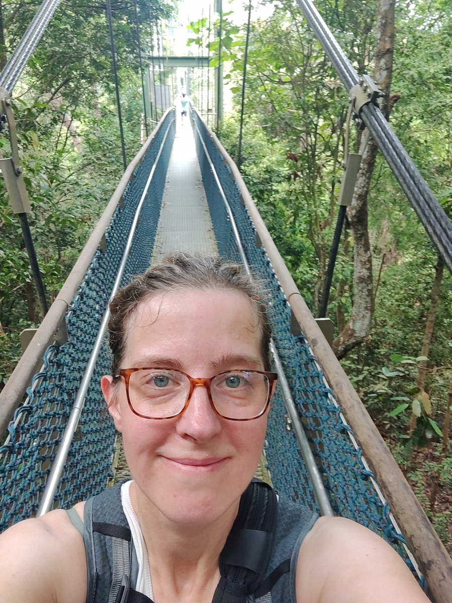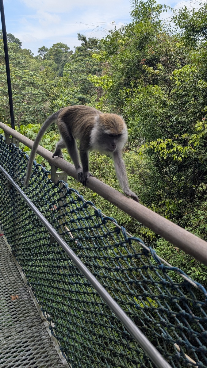 Am nächsten Morgen nehmen wir den Bus zum MacRitchie Reservoir. Das Gebiet ist ein Naturschutzareal mit einem Stausee, eingebettet in dichten Wald. Verschiedene Pfade führen durch die grüne Umgebung, Höhepunkt ist eine 250 Meter lange Hängebrücke.