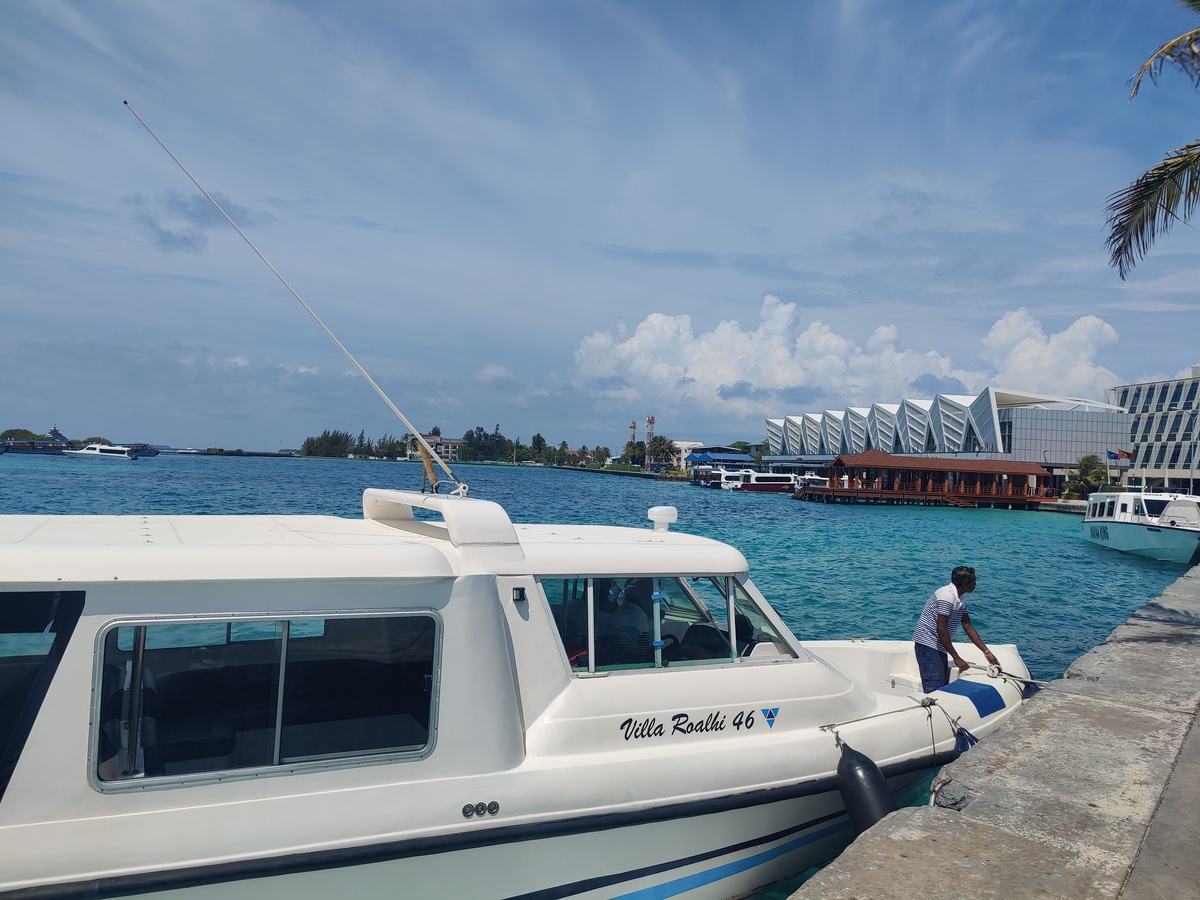 Auf Male angekommen füllen wir einen Einreisefragebogen aus, nehmen unsere Koffer entgegen und melden uns am Stand unseres Resorts, welchen wir durch erfragen finden. Unser Bootstransfer wird recht zügig organisiert. Zusammen mit fünf weiteren Personen werden wir ins Villa Nautica auf Lankanfinolhu verschifft. Das Boot peitscht über die Wellen und in kurzer Zeit sind wir auch schon angekommen. Das ist der Vorteil, wenn man etwas in Flughafennähe bucht.
