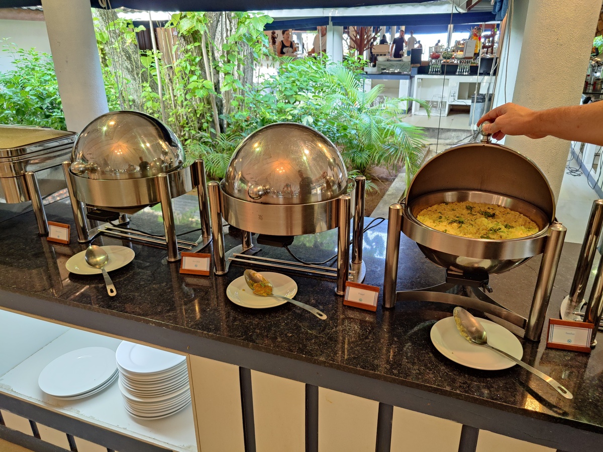 Wir haben Vollpension gebucht. Es gibt dreimal am Tag ein reichhaltiges Buffet. Es ist ein Mix aus unterschiedlichsten Speisen, wobei indische Gerichte überwiegen. Diese sind auch von ausgezeichneter Qualität, kein Wunder, da das Restaurantpersonal fast ausschließlich indischer Herkunft ist. Zusätzlich sind die indischen Gerichte zum größten Teil vegetarisch. So gibt es bei mir im Prinzip den ganzen Urlaub hindurch morgens, mittags und abends indische Curries. Die Auswahl hier wird nicht langweilig und enthält auch mal Gemüse, welches für uns eher exotisch ist, wie z. B. die Bitterfrucht.