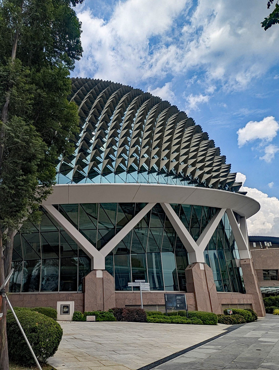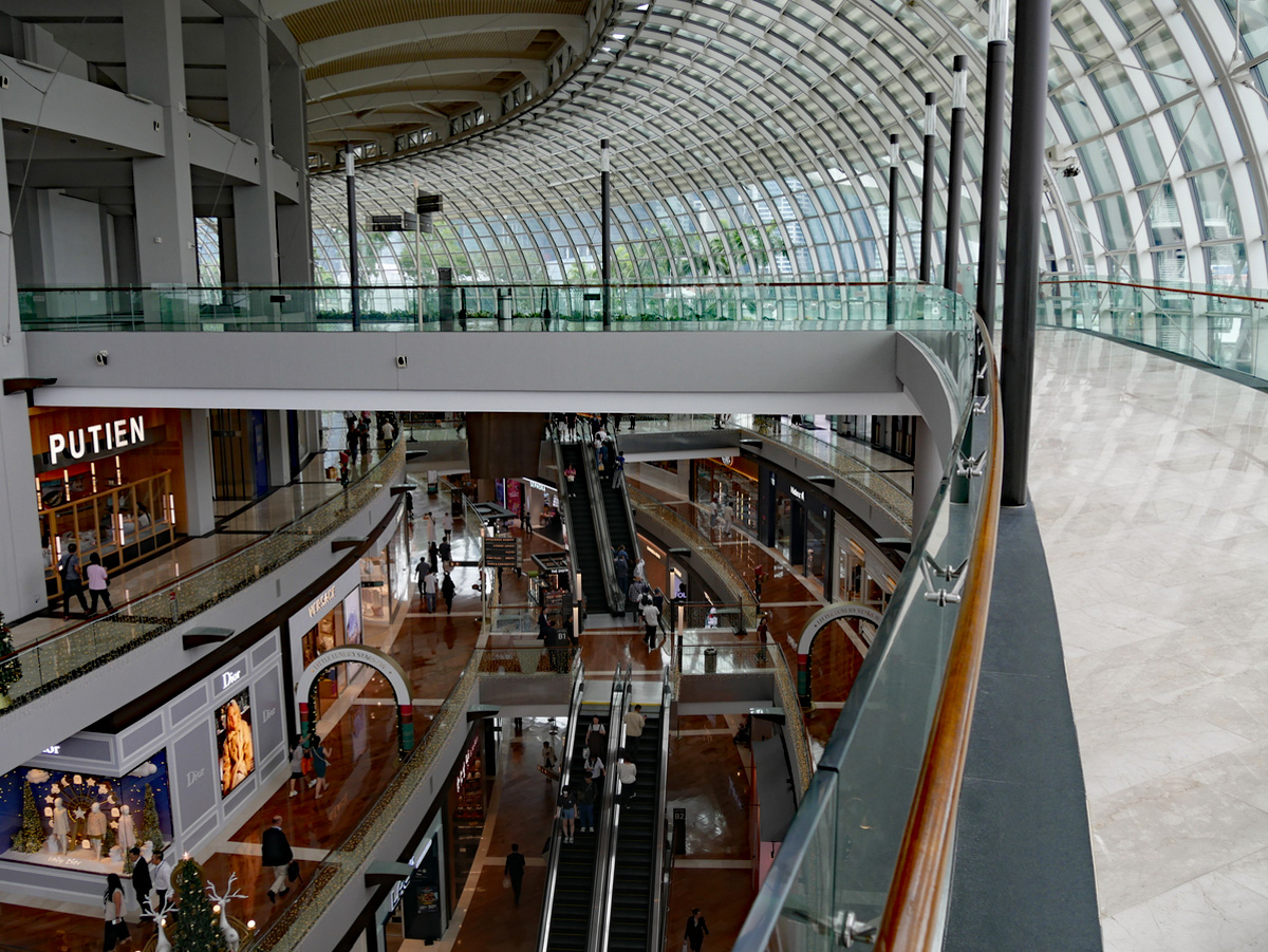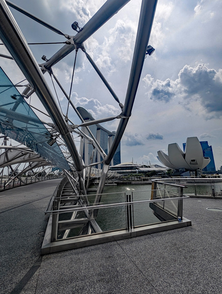 Nach einer kurzen Pause im wohltuenden Schatten einer Brücke setzen wir unseren Weg fort. Wir spazieren vorbei am Theaterhaus Esplanade, dessen Architektur an zwei überdimensionale Durian-Früchte erinnert, und überqueren die geschwungene Helix-Brücke. Schließlich erreichen wir den Eingang zur Einkaufsmall des Marina Bay Sands.