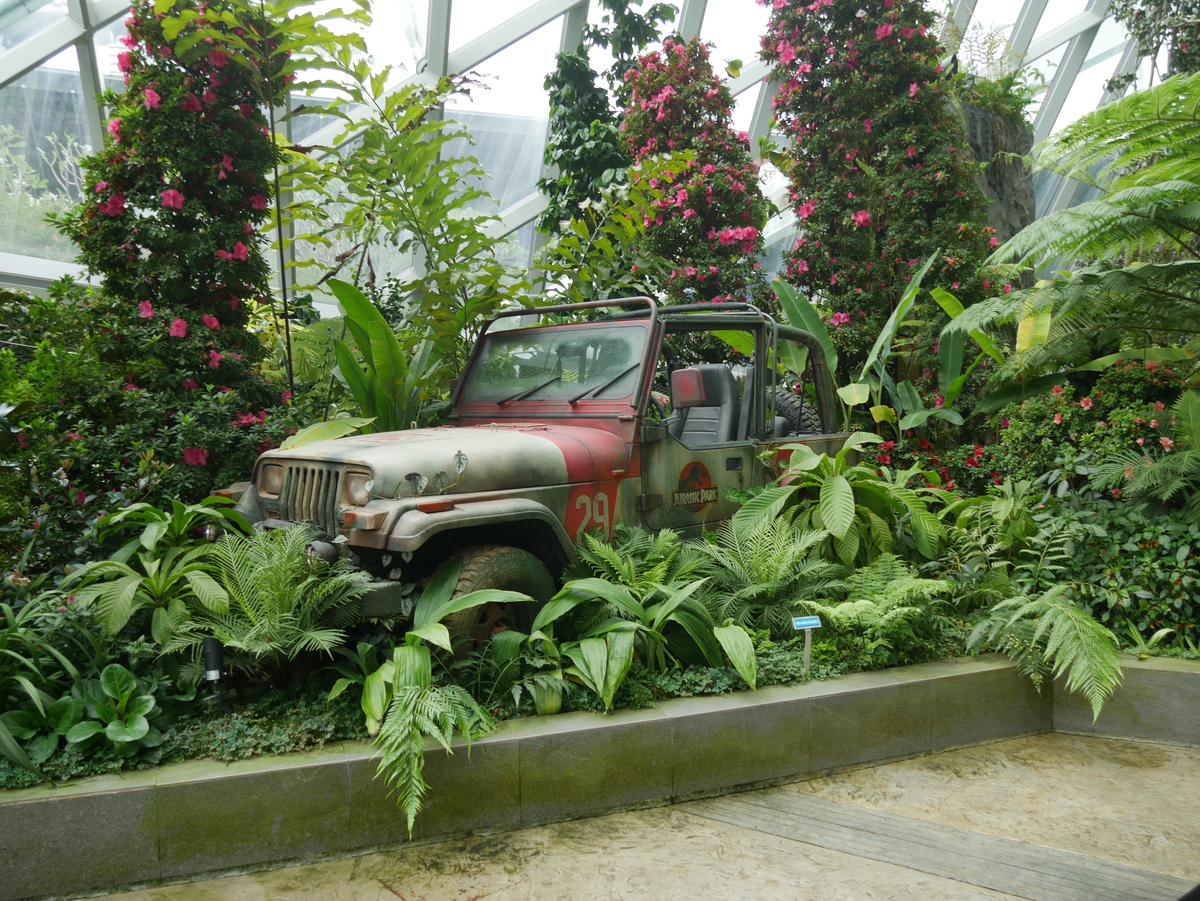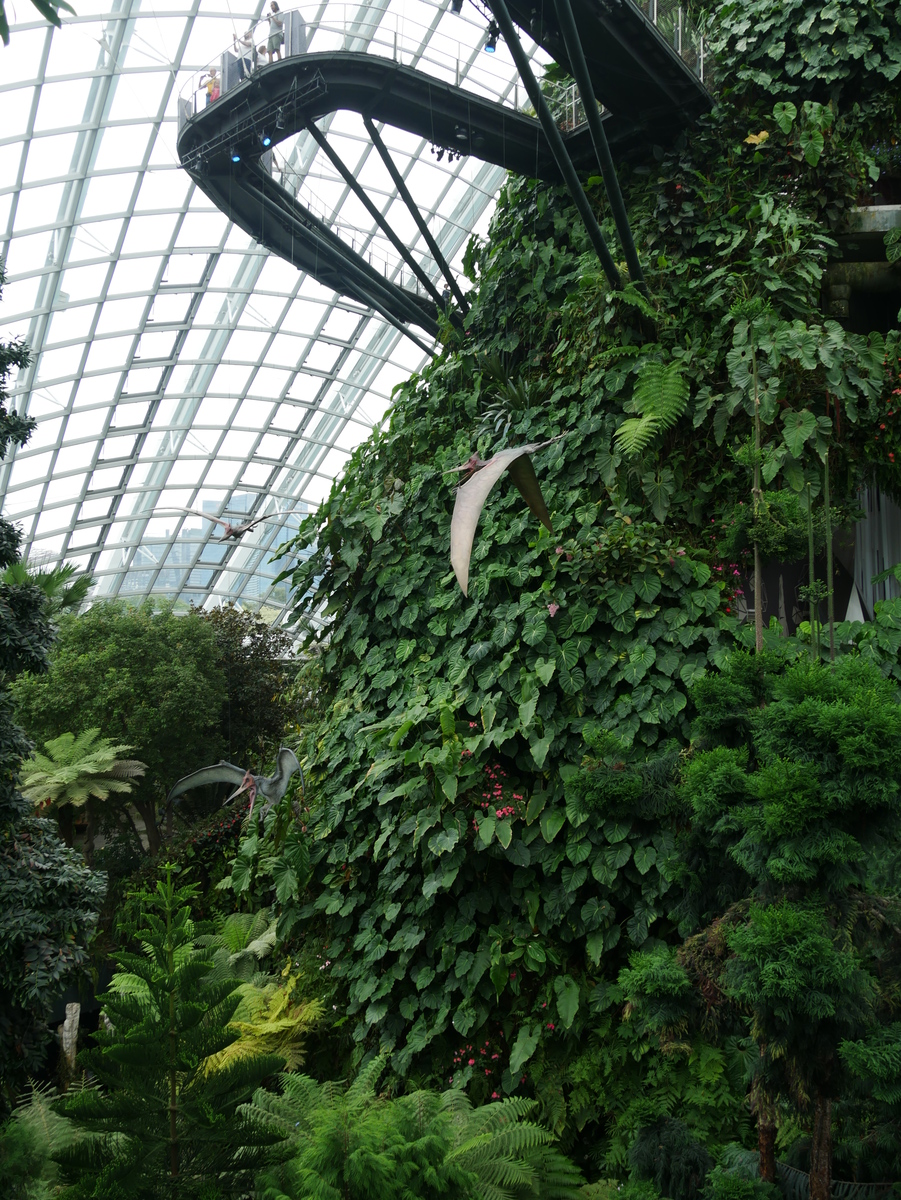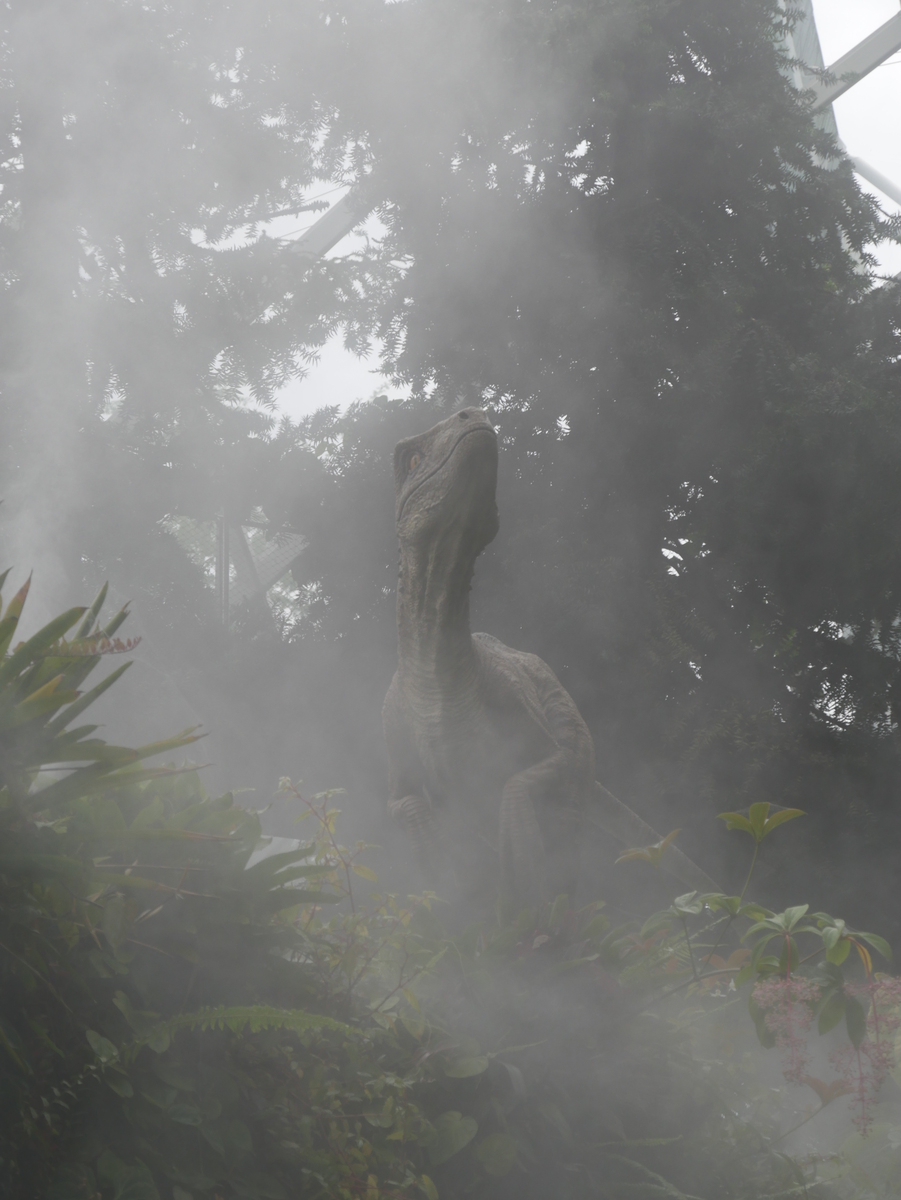 Wir genießen diesen einmaligen Ausblick und gehen anschließend weiter zur Ausstellung Jurassic World, die derzeit im Cloud Forest zu sehen ist. Unter einer riesigen Glaskuppel rauscht ein imposanter Wasserfall herab, umgeben von Pflanzenarten eines tropischen Regenwaldes – Farne, Moose und Orchideen. Einige dieser Pflanzen existierten bereits vor den Dinosauriern, eine perfekte Kulisse also für die Ausstellung.