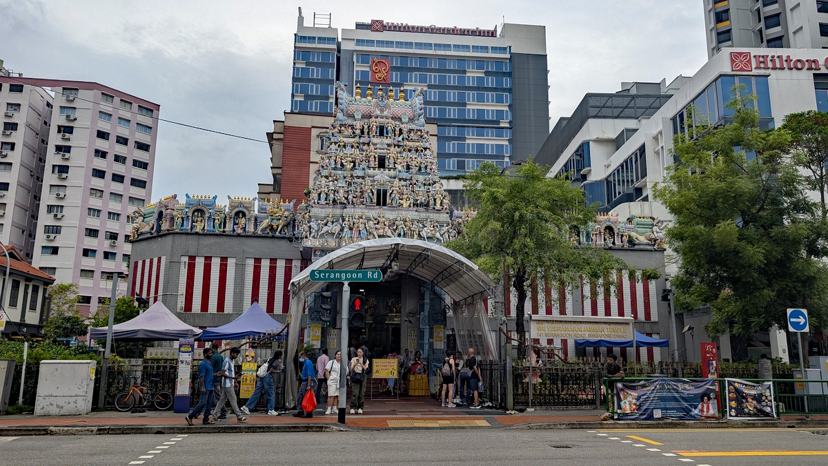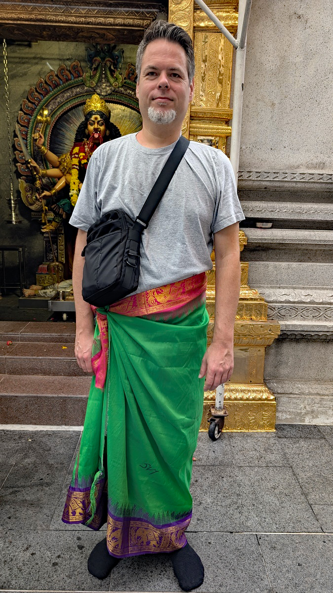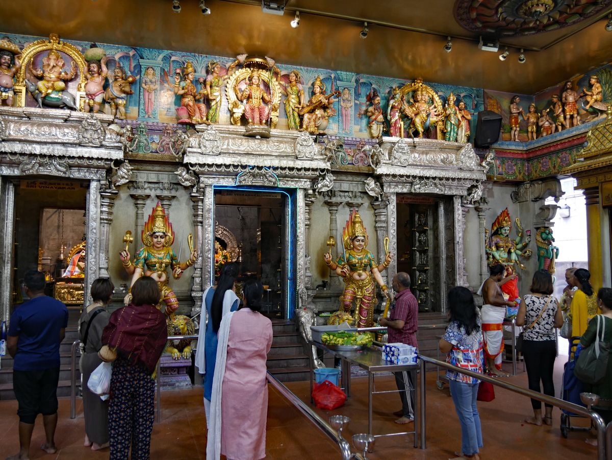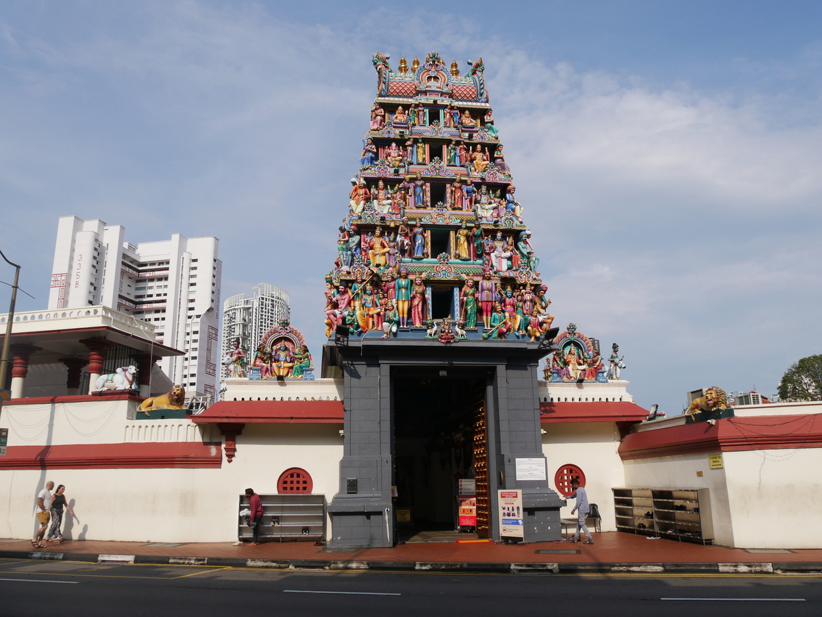 Wir erreichen den Sri Veeramakaliamman Tempel, einen der ältesten und bedeutendsten hinduistischen Tempel in Singapur. Bevor wir eintreten, ziehen wir – wie es sich gehört – die Schuhe aus. Da Sörens Knie nicht bedeckt sind, hüllt er sich zusätzlich in ein Tuch. Nun sind wir „tempelfein“ und betreten das Heiligtum.