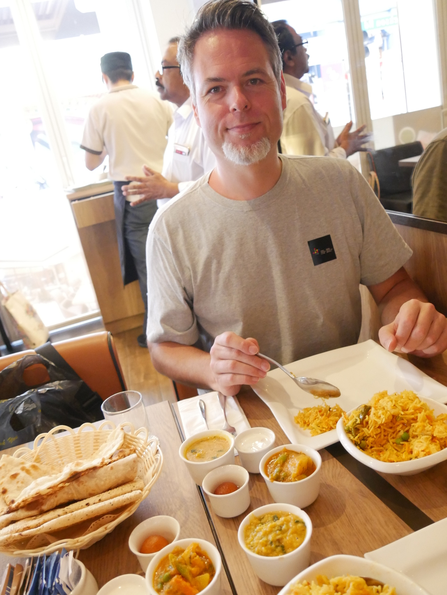 Am frühen Nachmittag wird es Zeit für Lunch. Wir kehren in ein kleines Eckrestaurant ein und bestellen zwei Sets vegetarisches Thali. Ein Thali besteht aus Reis, verschiedenen Currys und Broten – eine bunte Mischung, die nicht nur sättigt, sondern auch geschmacklich begeistert. Alles ist sehr lecker und zudem recht preiswert.