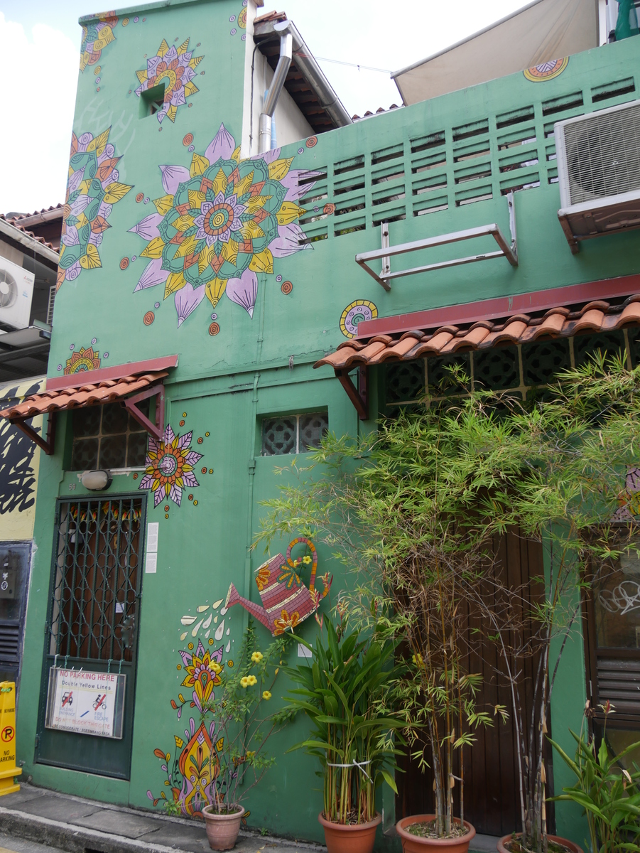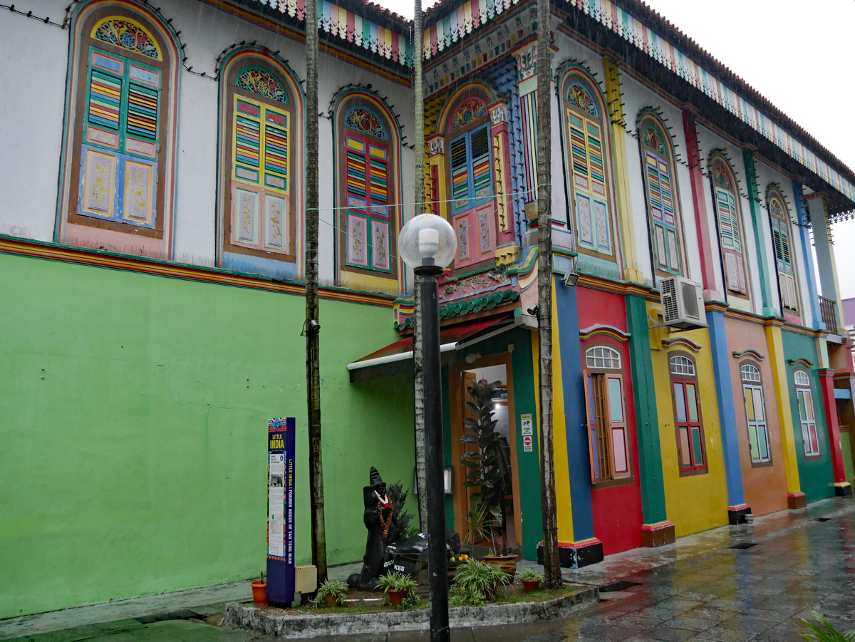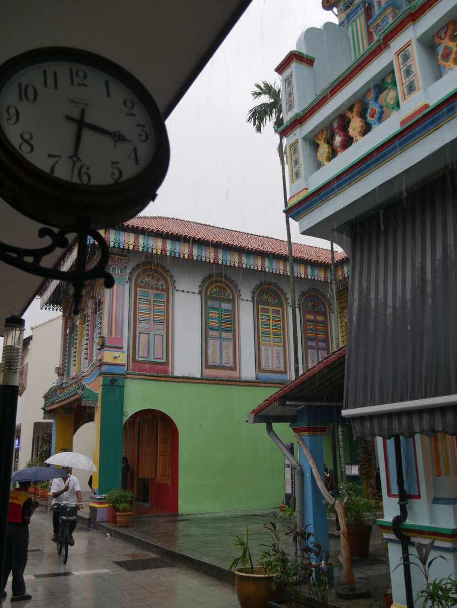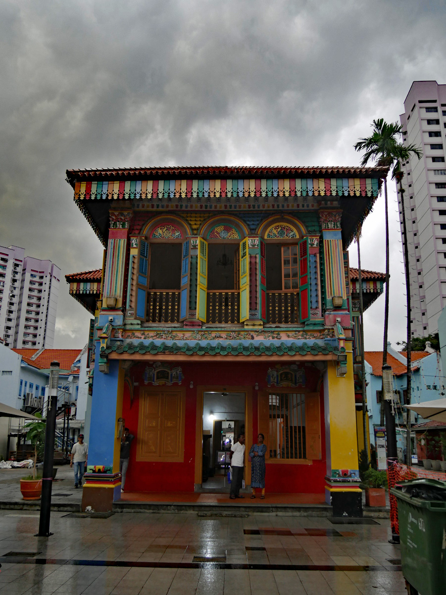 Nach dem Essen machen wir uns auf den Weg zurück zur MRT-Station, als plötzlich ein Wolkenbruch niedergeht – es schüttet wie aus Eimern. Zufälligerweise stehen wir genau vor dem House of Tan Teng Niah und können uns trotz des Regens an diesem farbenfrohen Gebäude erfreuen.
