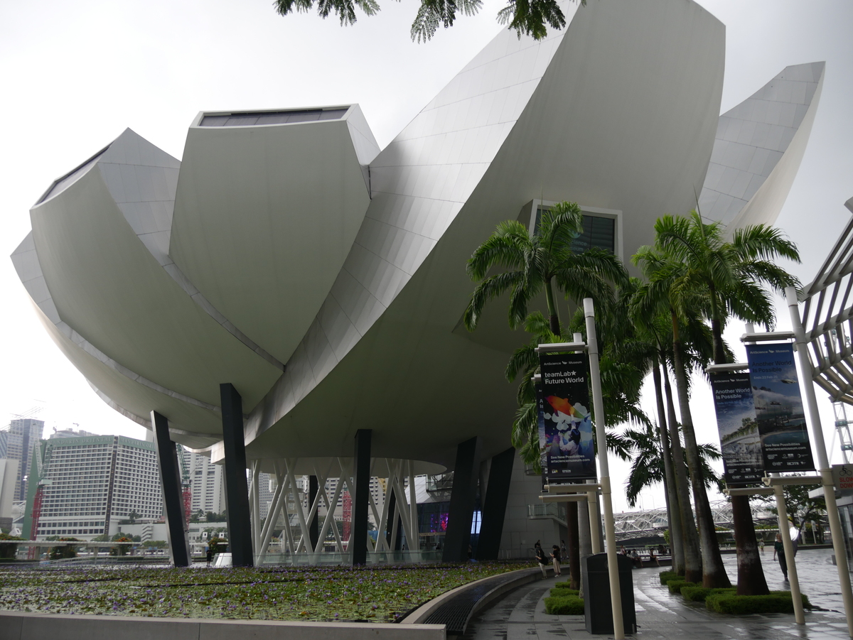 Wir wollen ins ArtScience Museum am Marina Bay. Wir bewegen uns mit Blitzen und Donnergrollen im Hintergrund auf das futuristische Gebäude zu, welches an eine Lotusblüte erinnert.