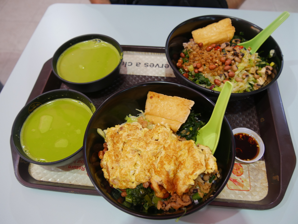 Wir wollen noch einen Punkt von unserer „Must-try“ Liste abarbeiten und so setzen wir uns in einen Bus, der uns in den Stadtteil Bukit Merah bringt. Hier gibt es im Hawker Center einen Stand, der „Lei Cha“ auch genannt Thunder Tea Rice anbietet – und zwar komplett fleischlos.