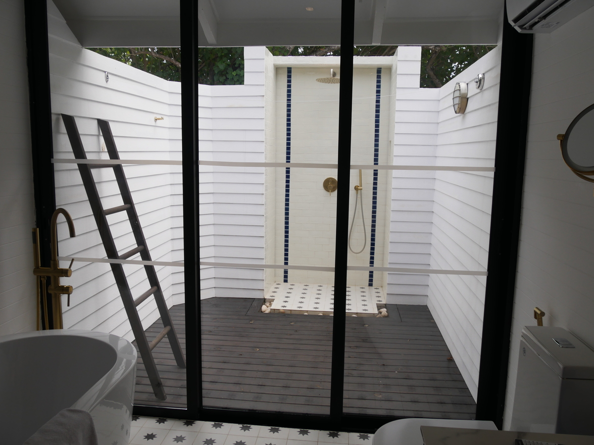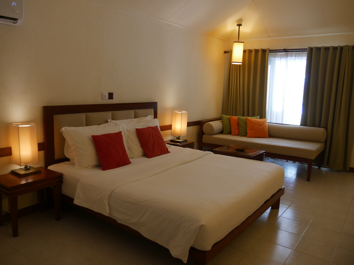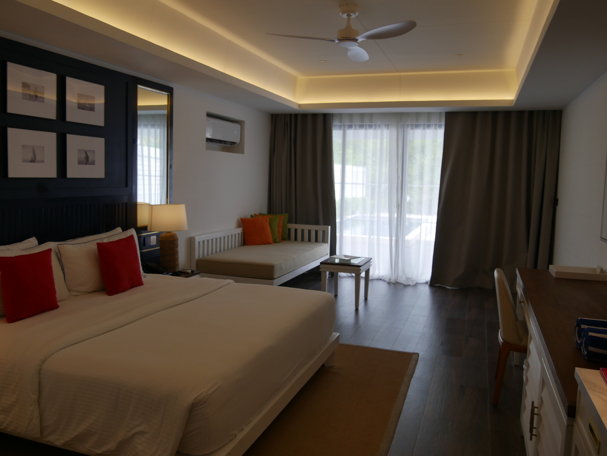 Wir haben uns für eine Beach Villa ohne Pool entschieden. Dies ist die einfachste Kategorie in der Villa Nautica. Da wir beide sehr gerne schnorcheln und auch Tauchscheine haben, betrachten wir das Meer als unseren Pool. Dass die Beach Pool Villas aber auch sonst in der Ausstattung merklich moderner sind und eher dem 5-Sterne-Niveau des Resorts entsprechen, merken wir erst später, als wir für die letzten beiden Übernachtungen ein kostenloses Upgrade erhalten. Aber hey, man fliegt ja nicht auf die Malediven um in einer Hütte abzuhängen. Auch in der einfacheren Kategorie ist eine Klimaanlage verbaut. Das ist für erholsamen Schlaf in diesem Tropenklima essenziell.