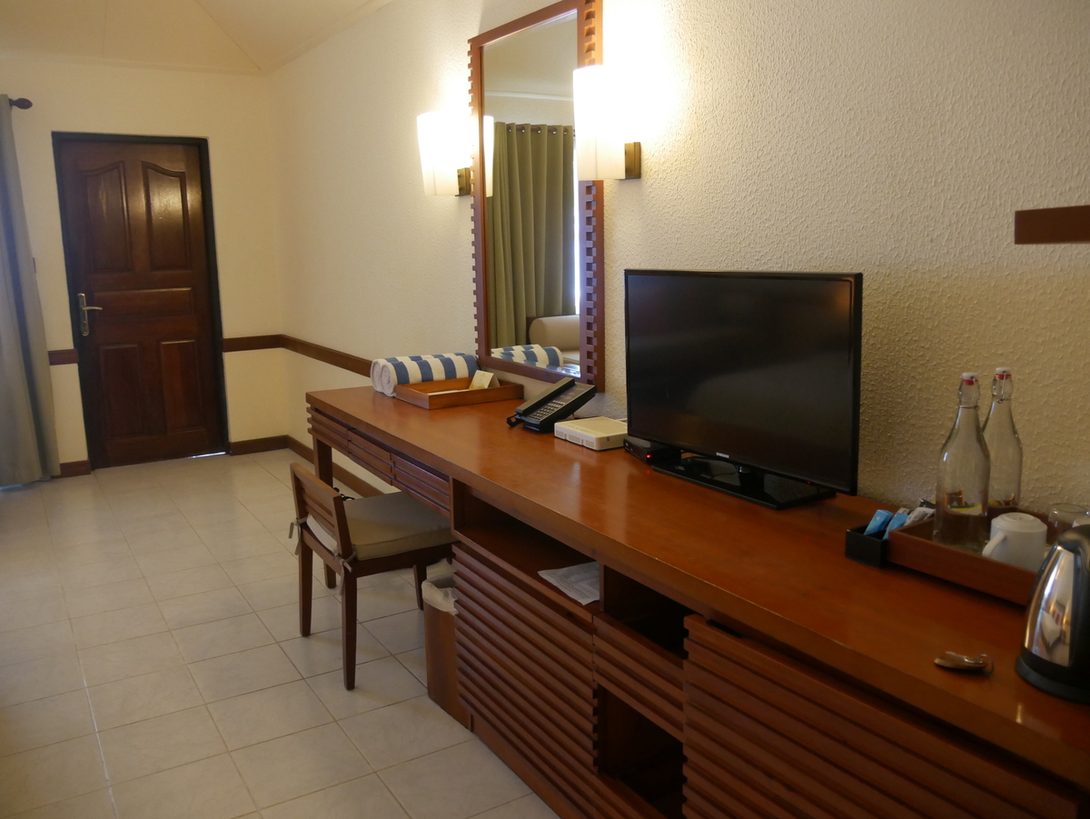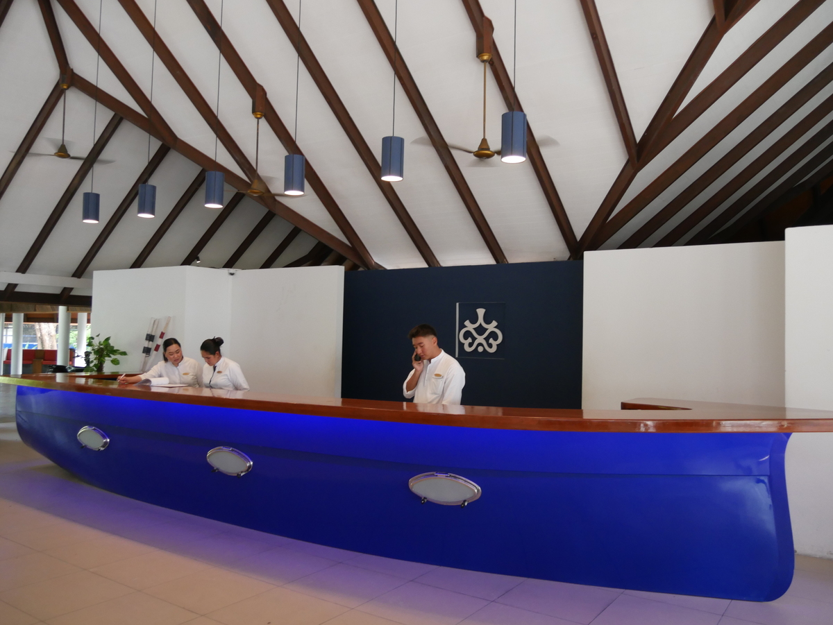 Am Steg werden wir von Hotelpersonal empfangen. Unser Gepäck wird uns abgenommen und wir werden zum Check-in in die Lobby gebracht. Nachdem dieser erledigt ist, werden wir mit einem elektrischen Buggy in unsere Unterkunft gefahren.