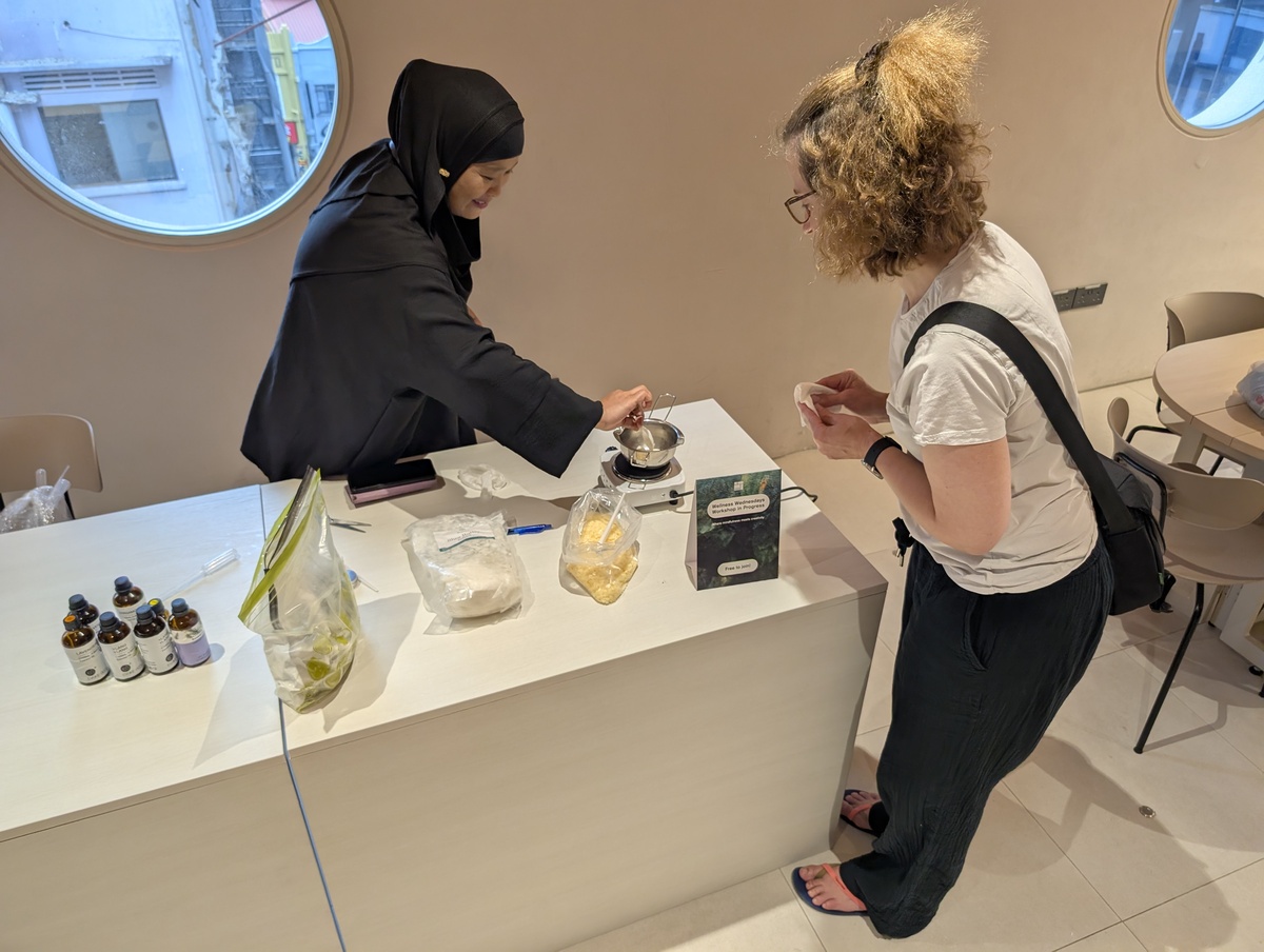 Ich fülle also anderthalb Löffel Bienenwachsgranulat sowie etwas Sheabutter in das kleine Töpfchen und gebe anschließend ein paar Tropfen ätherischer Öle meiner Wahl hinzu – Ylang Ylang und Bergamotte. Die Mischung wird in zwei Cremedosen abgefüllt, die ich mitnehmen darf und künftig immer dann nutzen soll, wenn ich ein wenig Entspannung brauche. Ich bin begeistert – was für ein schöner Start in den Tag.