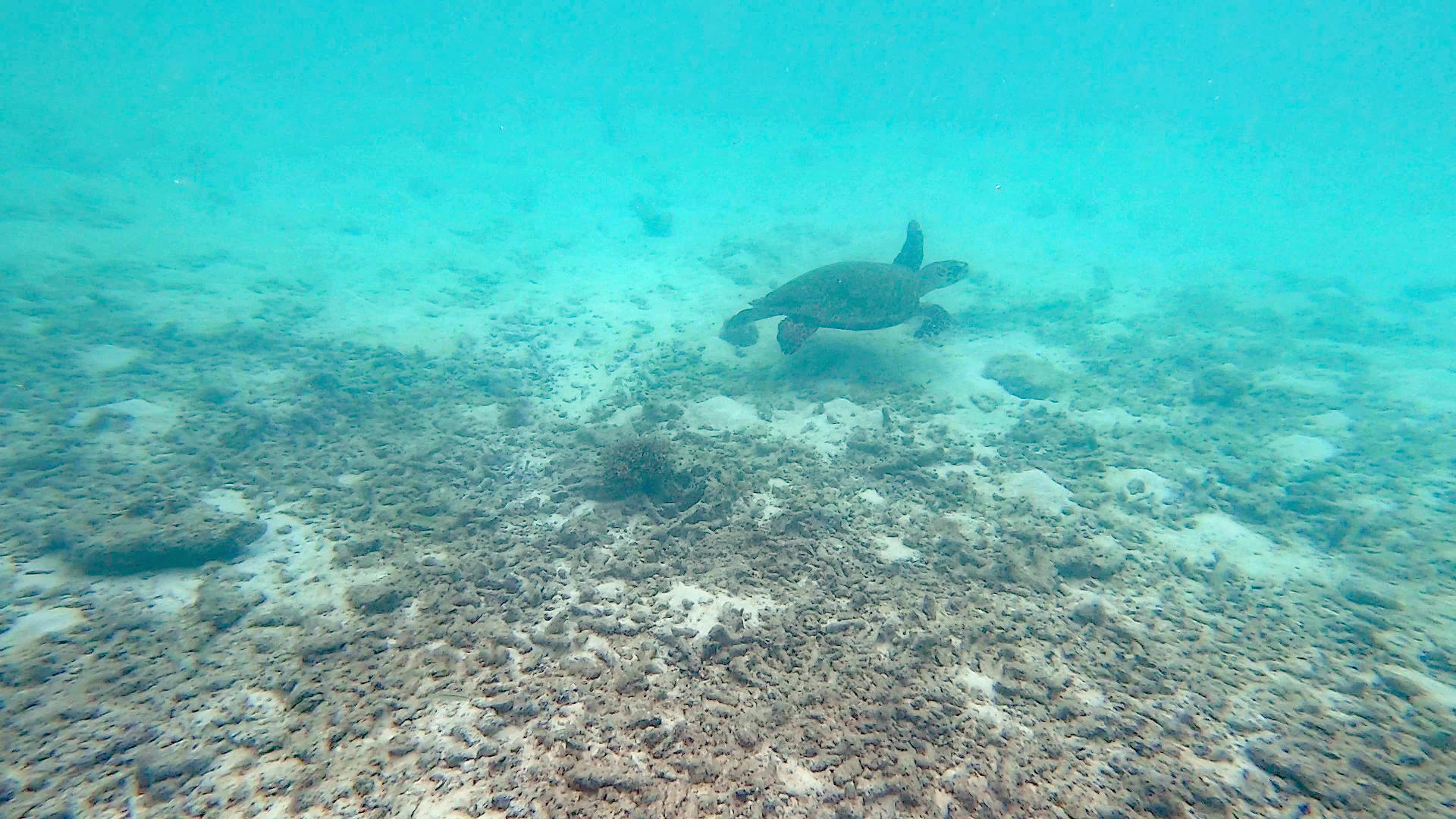 Per Zufall entdecken wir außerdem einen Federschwanzrochen, der nur wenige Meter vom Strand entfernt im Sand verborgen ruht. Unser Highlight zum Abschluss des Urlaubs ist jedoch eine weitere Begegnung mit einer Schildkröte, die wir beim Schnorcheln ein Stück begleiten dürfen – diesmal sogar mit der GoPro, um diesen einzigartigen Moment festzuhalten.