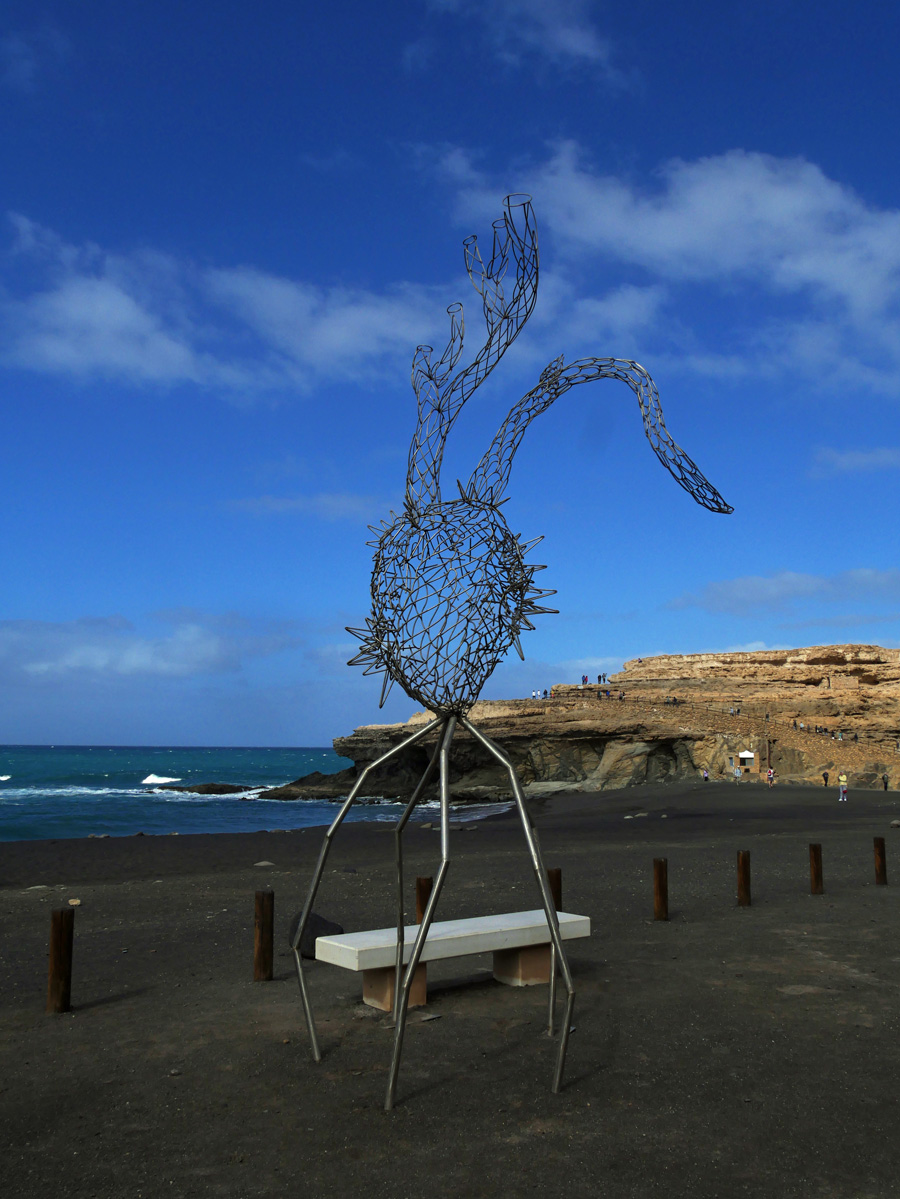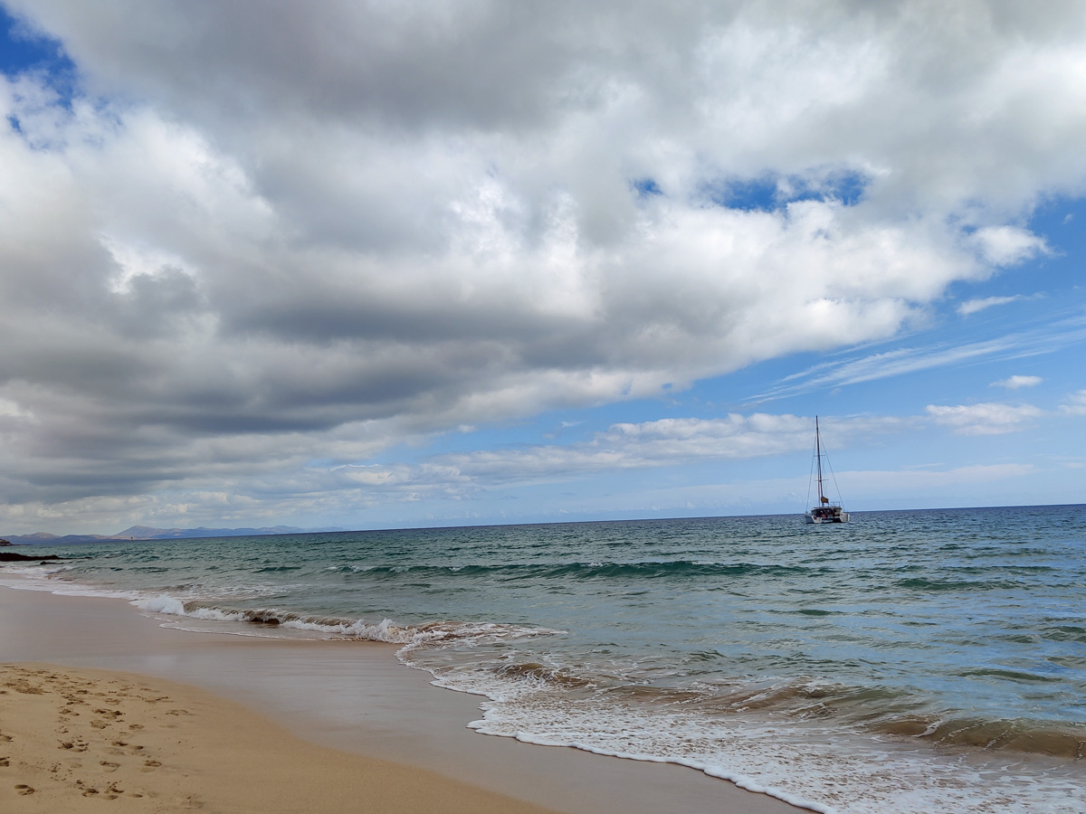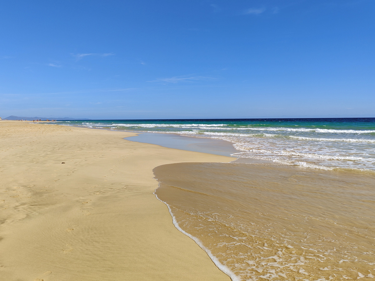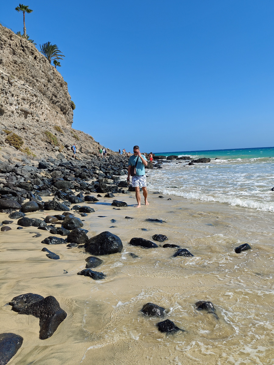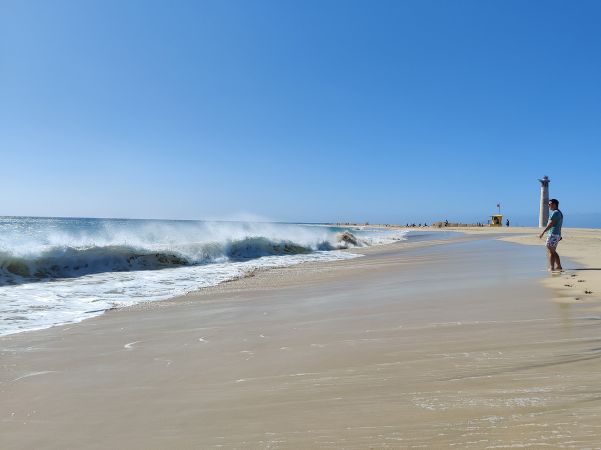 Am nächsten Morgen starten wir ausgeschlafen mit einem reichhaltigen Frühstück. Das Buffet lässt keine Wünsche offen. Anschließend spazieren wir am Strand entlang, von Playa Butihondo bis Playa Jandia, und verlassen diesen dort beim großen Walskelett, um die Promenade von Morro Jable entlangzuschlendern. Hier laden viele Geschäfte zum Bummeln ein. In einem Café genießen wir einen Barraquito, der den Kanarenurlaub erst komplett macht. Anschließend gehen wir den Weg zurück – insgesamt knapp 9 km. Zurück am Playa Butihondo, der auch bei Freunden der Freikörperkultur beliebt ist, stürze ich mich in die erfrischenden Wellen des Atlantiks.
