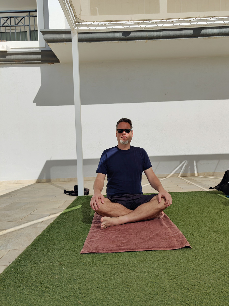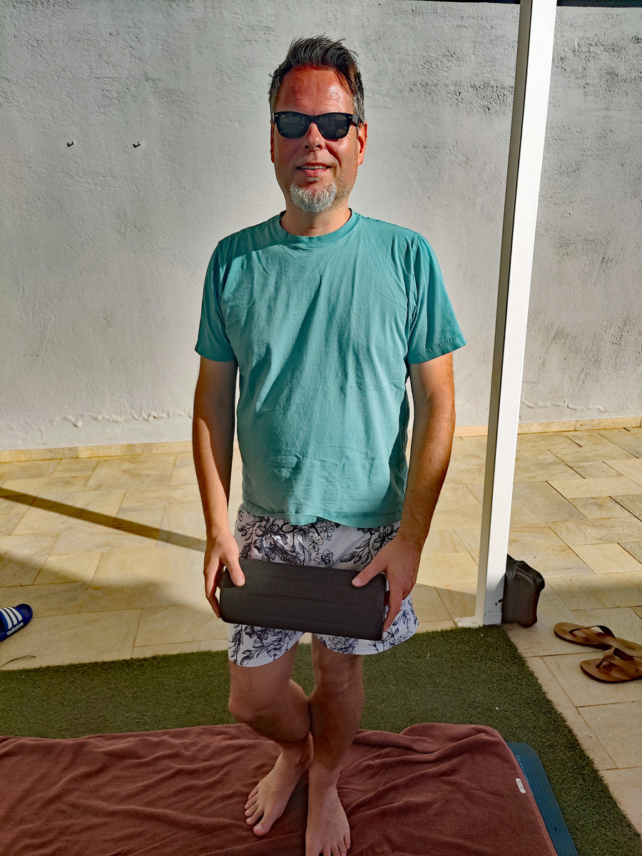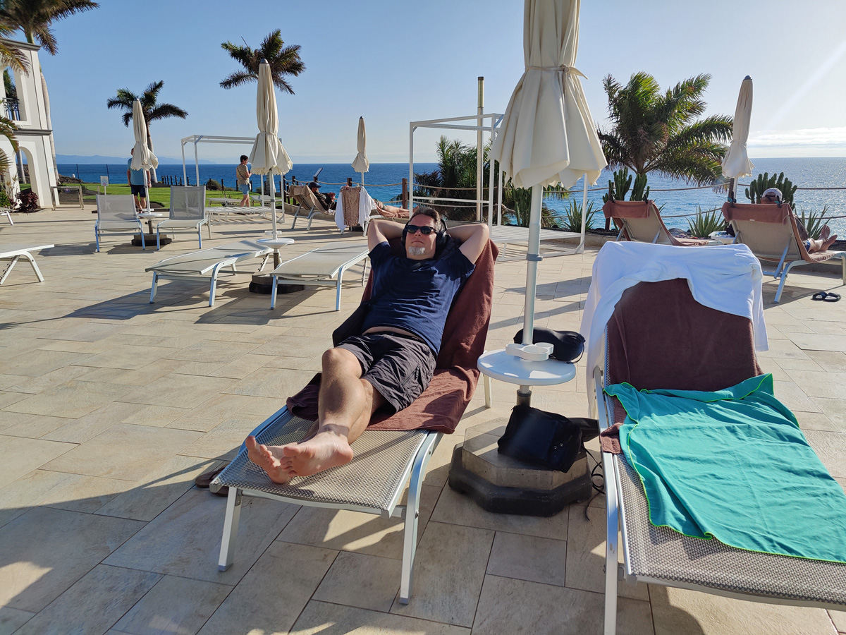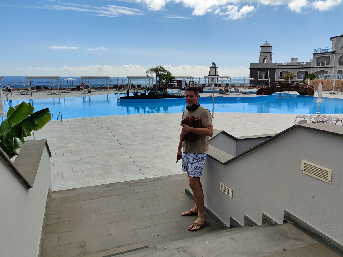 Am nächsten Tag feiern wir Sörens Geburtstag. Nach dem Frühstück sichern wir uns Liegen am Pool, lesen und hören Podcasts. Um 12 Uhr nehmen wir an einem Rückenfit-Kurs teil. Die Trainerin leitet uns auf einer großen Terrasse mit Atlantikblick durch Übungen zur Mobilisierung und Kräftigung von Rücken und Körpermitte – großartig. Anschließend springen wir zur Abkühlung nochmal in den Atlantik.