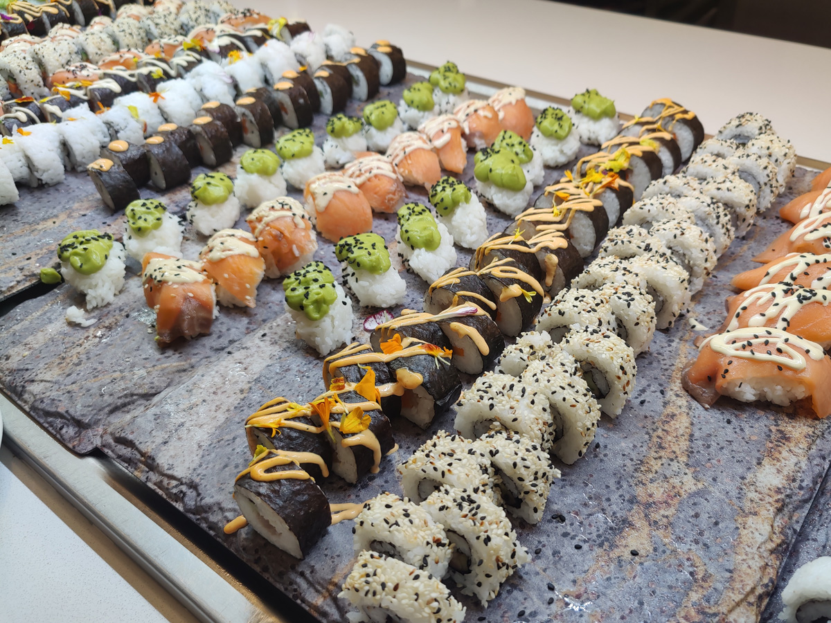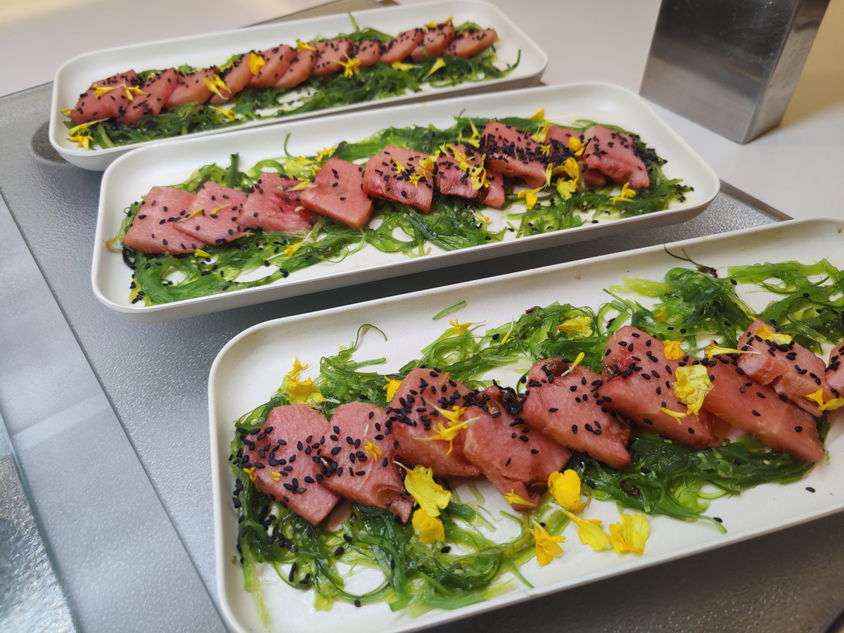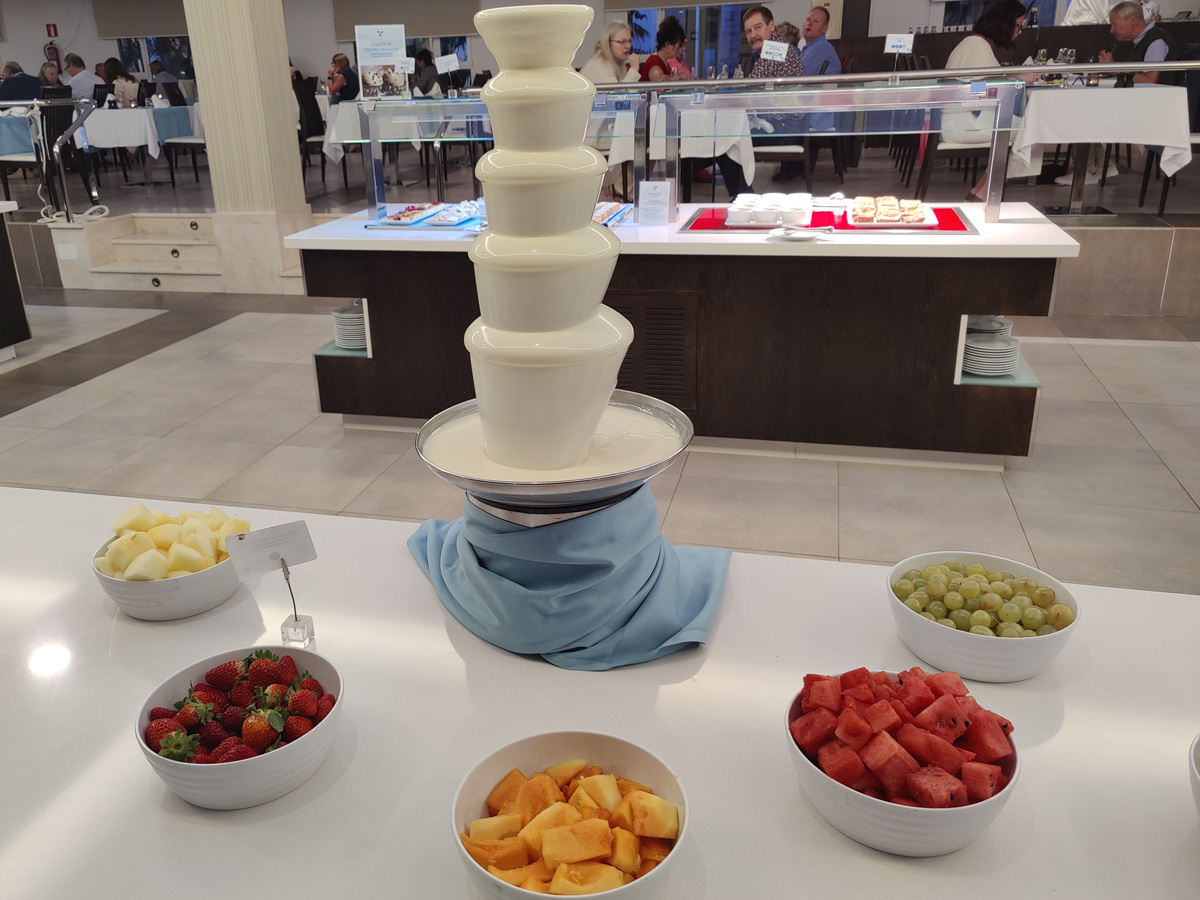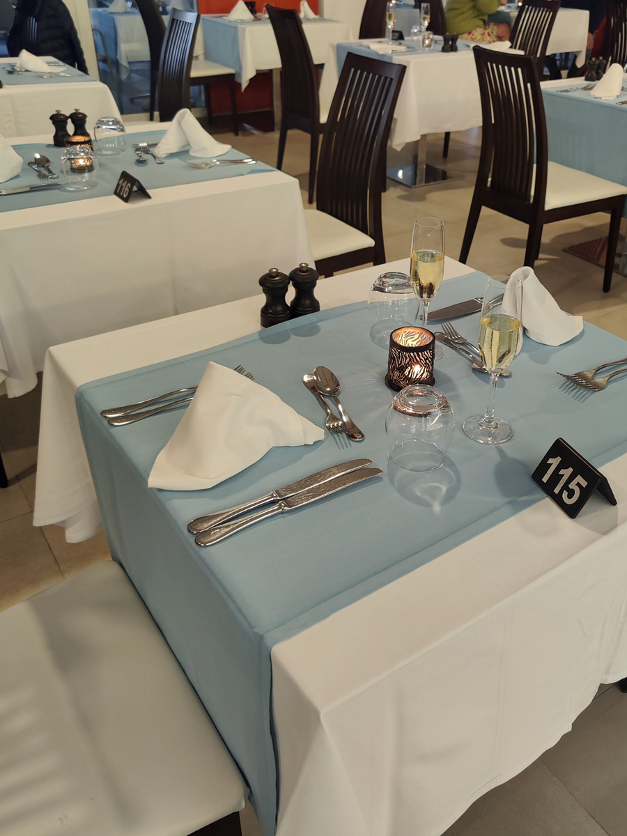 Am Abend veranstaltet das Hotel ein „Atlantik Dinner“. Wir werden mit einem Glas Cava empfangen, die Tische sind festlich gedeckt, und das Buffet mit Sushi und asiatischen Spezialitäten ist hervorragend.