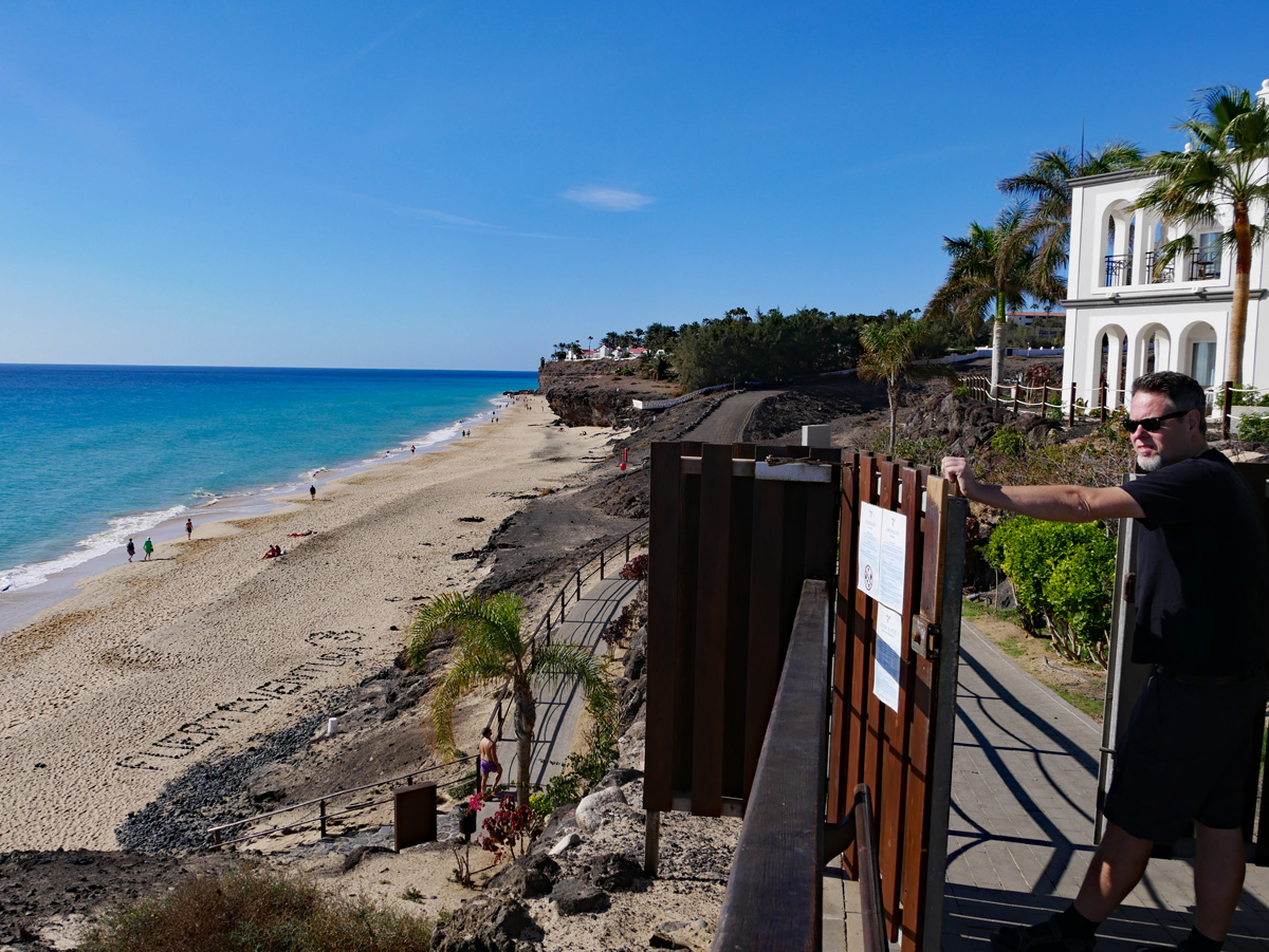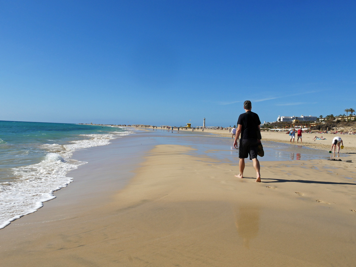 Um noch etwas Bewegung zu bekommen, gehen wir am Strand entlang bis zum Playa Jandia, einem der meistbesuchten Strände im Süden. Die kleinen gelben Rettungsschwimmerposten lassen fast Miami Beach-Flair aufkommen. Neben der Bewegung ist unser Ziel auch, einen Korkenzieher zu besorgen. Es ist mindestens das dritte Mal, dass wir keinen dabei haben – jedes Mal an der Hotelbar zu fragen, ist etwas unangenehm. Im kleinen Spar in Jandia werden wir fündig und schlendern am Strand zurück.