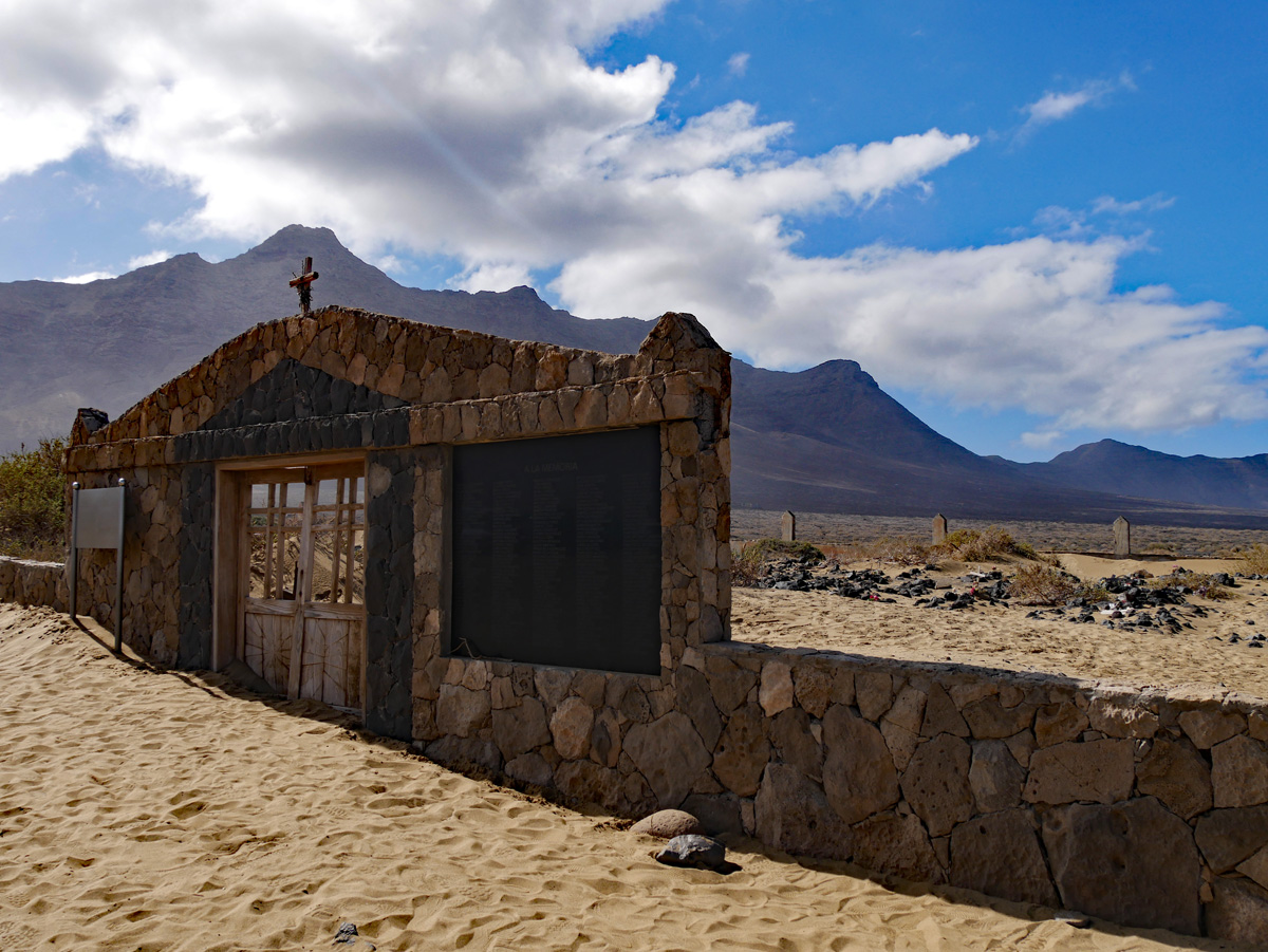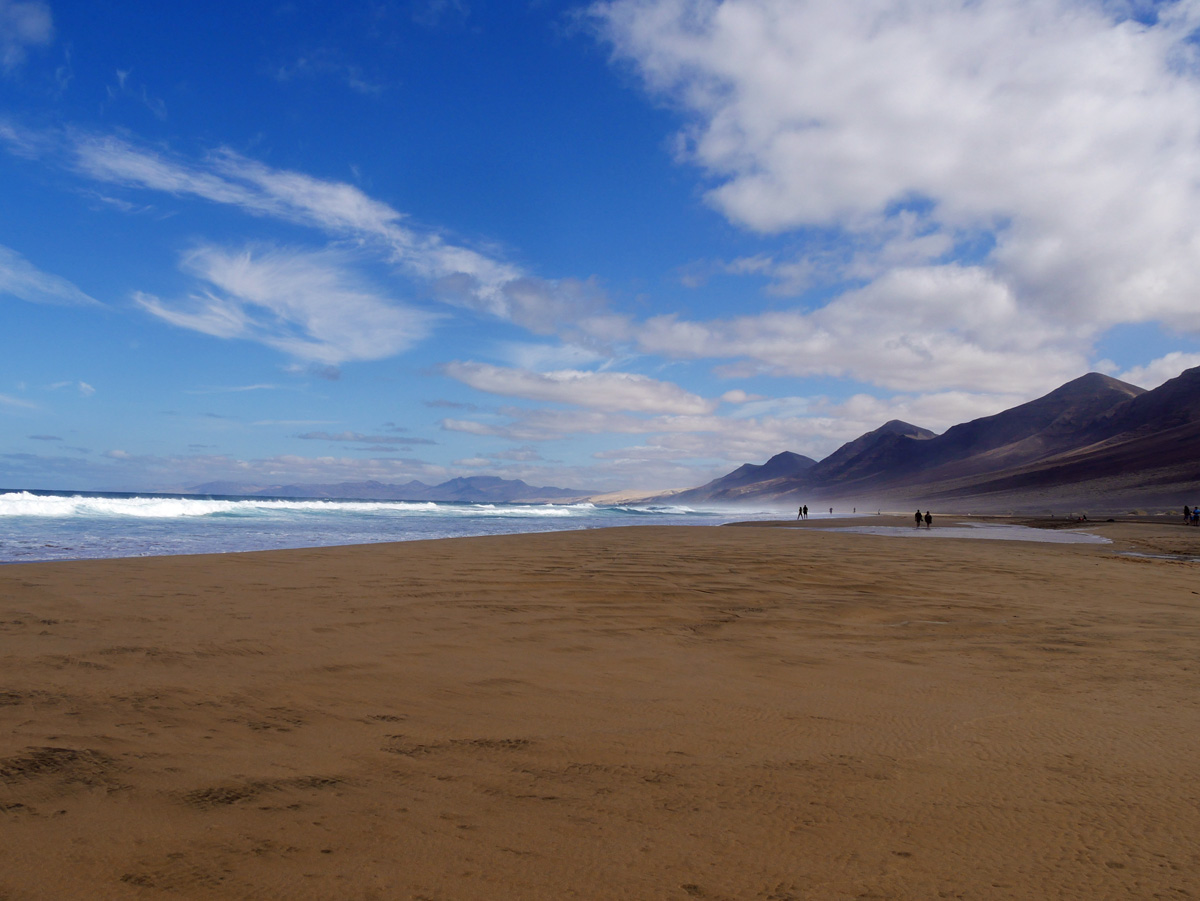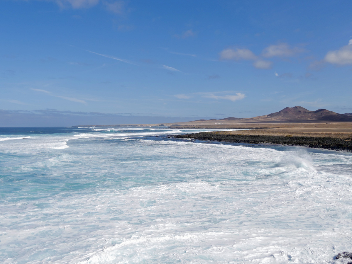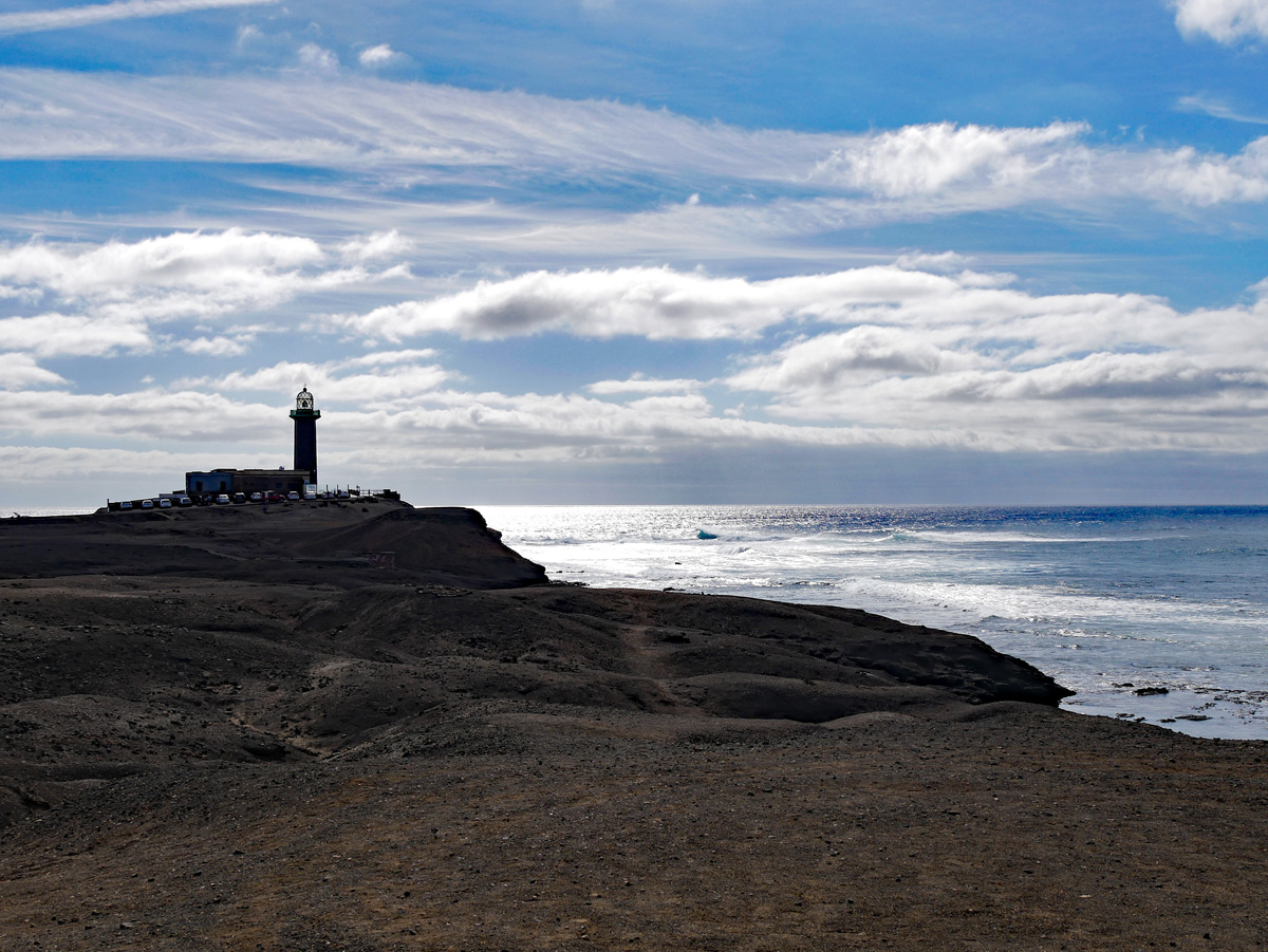 Dienstag fahren wir mit dem Auto durch den Nationalpark von Jandia Richtung Süden. Über eine staubige Piste erreichen wir den Leuchtturm Faro de Jandía, erbaut 1864 und einer der ältesten der Kanaren. Hier am südlichsten Punkt Fuerteventuras weht ein kräftiger Wind und wir genießen den Blick auf die Klippen und die gewaltigen Atlantikwellen. Weiter sehen wir das beeindruckende Bergmassiv, das den Strand von Cofete umgibt. Cofete selbst ist abgelegen, nur über die Piste von Morro Jable erreichbar. Der Strand eignet sich kaum zum Baden, ist aber aufgrund der eindrucksvollen Kulisse definitiv einen Besuch wert.
